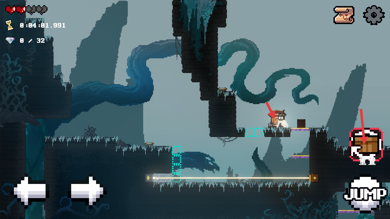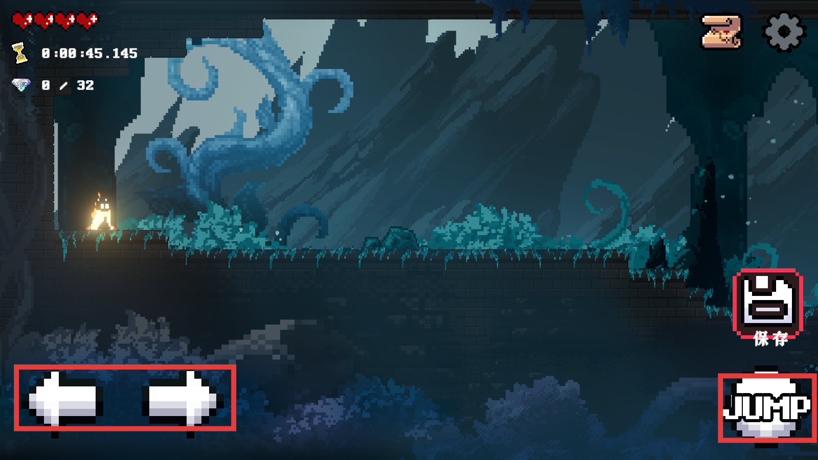 1、开局用左右方向键移动角色,点击【JUMP】可跳跃,同时关注【0/32】钻石收集进度,适时点【保存】。