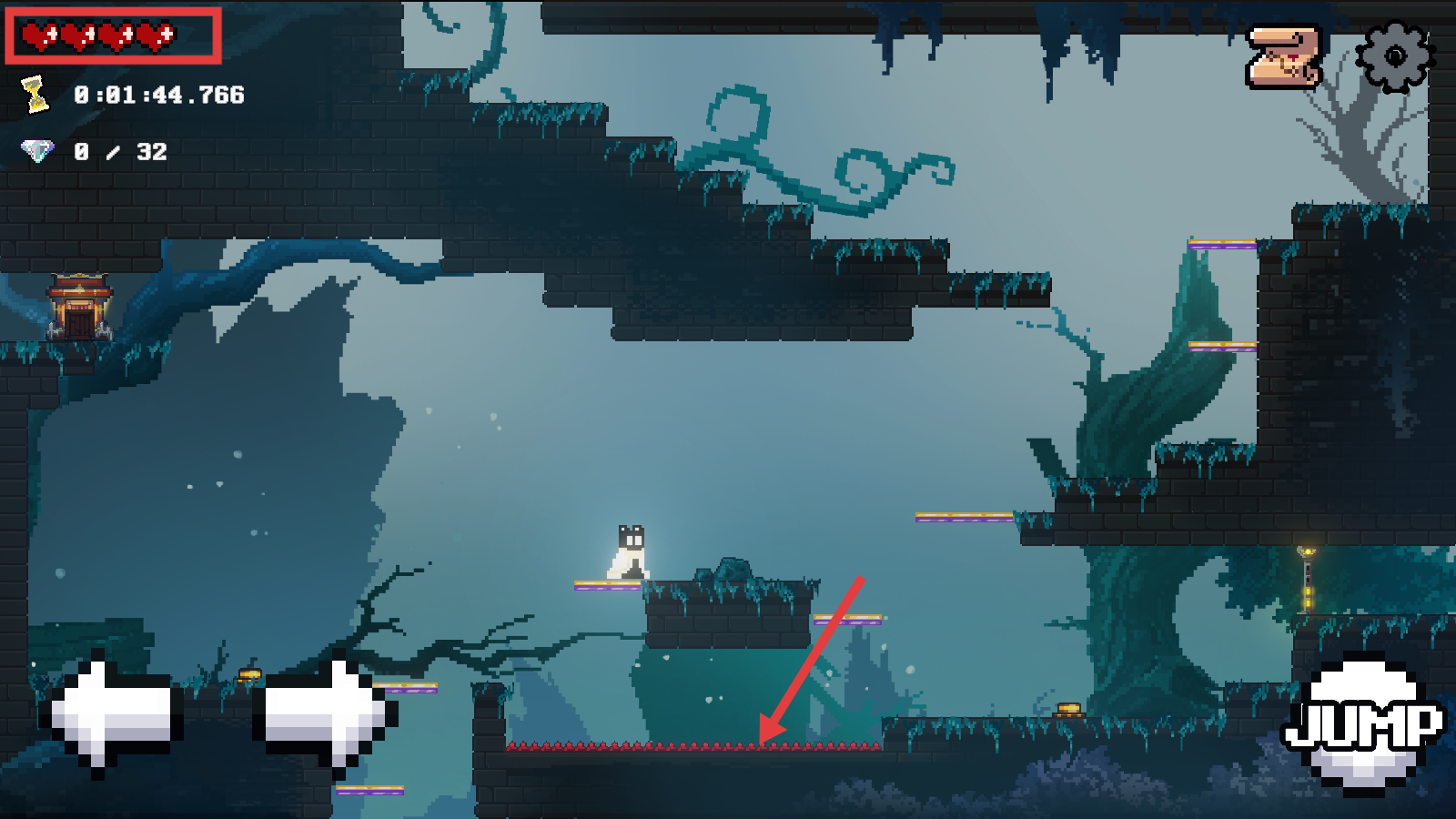 2、留意左上角血量,遇到红色尖刺区域要提前操作【JUMP】跳跃躲避,防止血量减少影响进程。