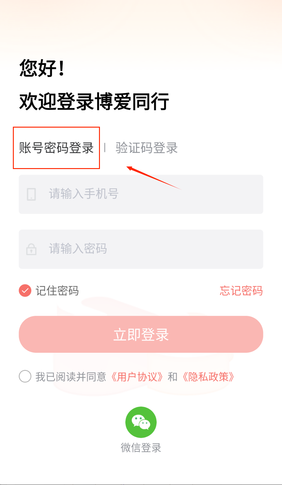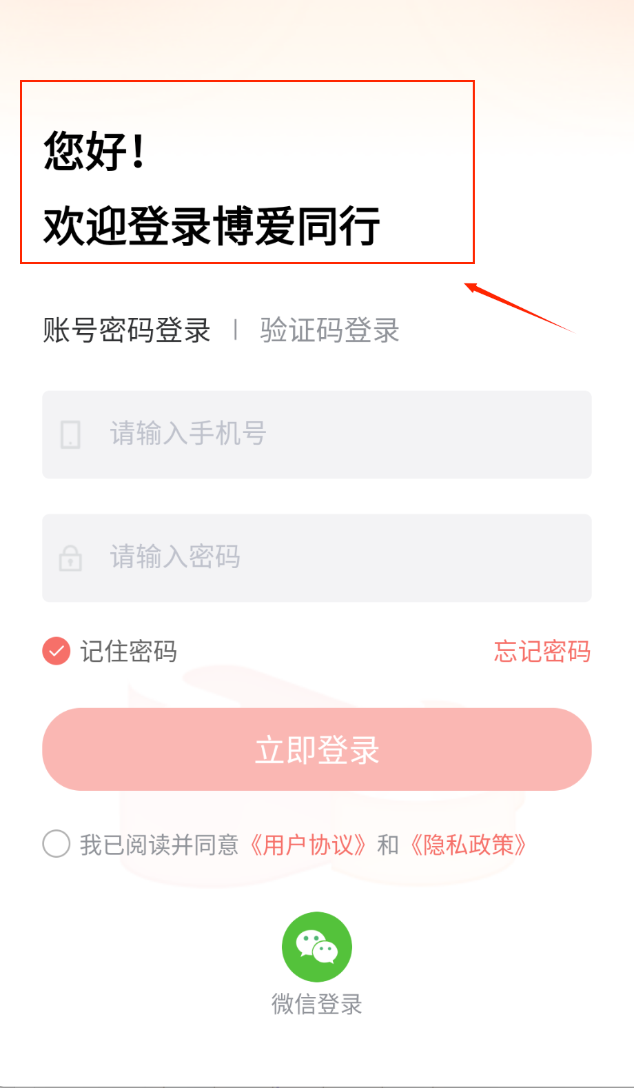 1、打开软件就能看到清爽的登录界面啦,最上方显示着当前时间,中间有"欢迎登录博爱同行"的问候语,两种登录方式任你选呢。