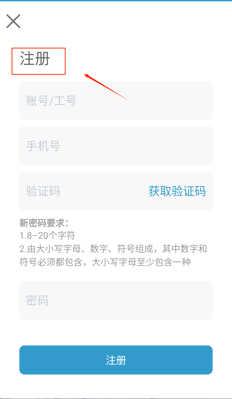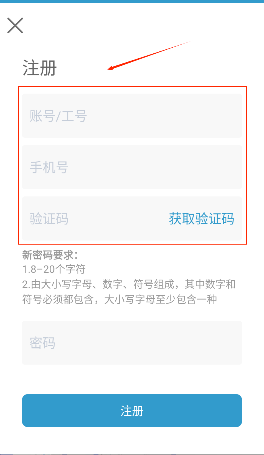 2、注册需填写工号/手机号,获取验证码后设置8-20位密码呀。密码需含大小写字母、数字和符号啦。