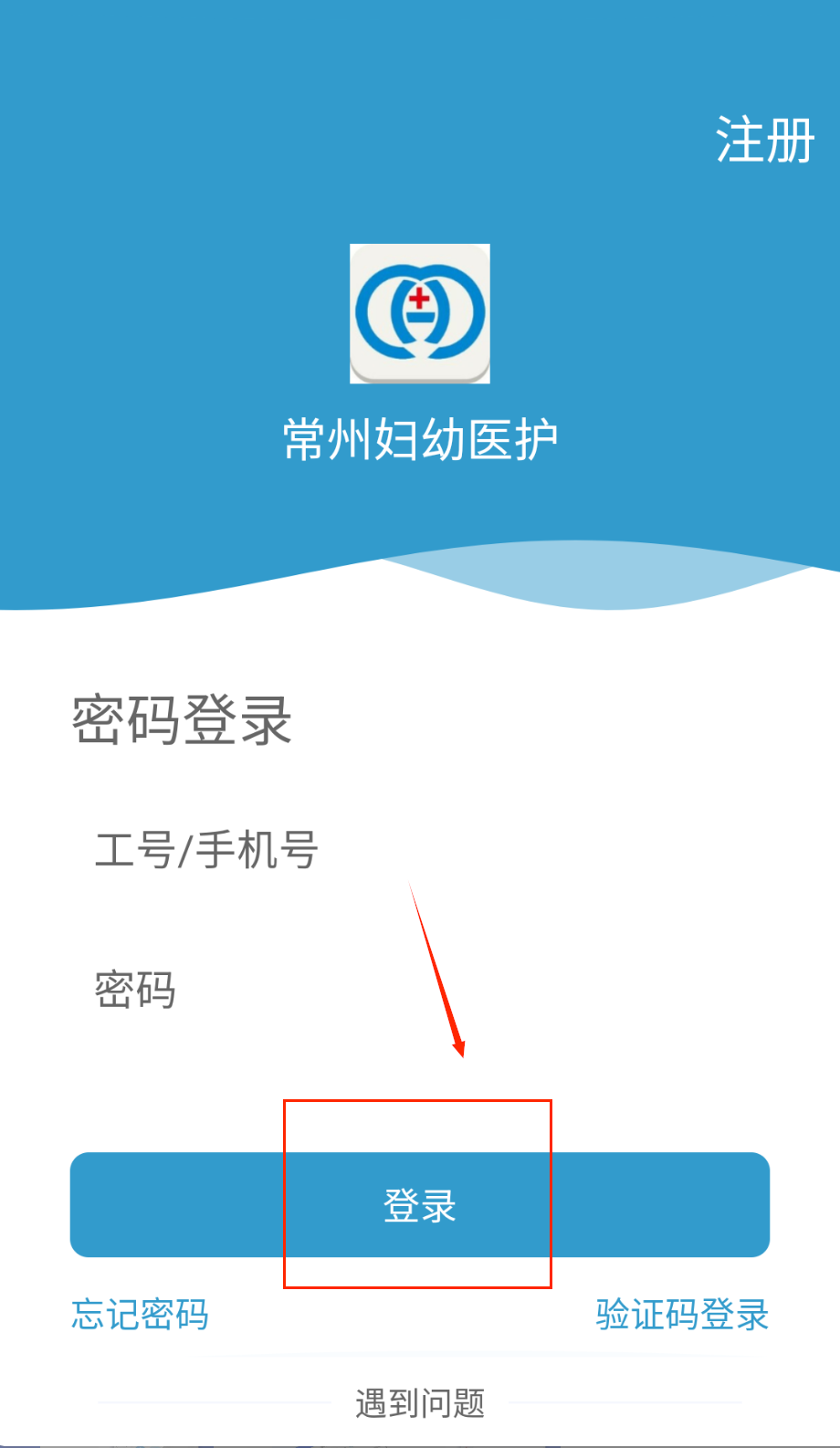1、打开APP进入登录页,顶部显示时间状态,中间是"常州妇幼医护"标识呀。点击"注册"进入账号创建页面哦。