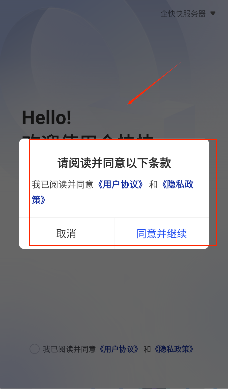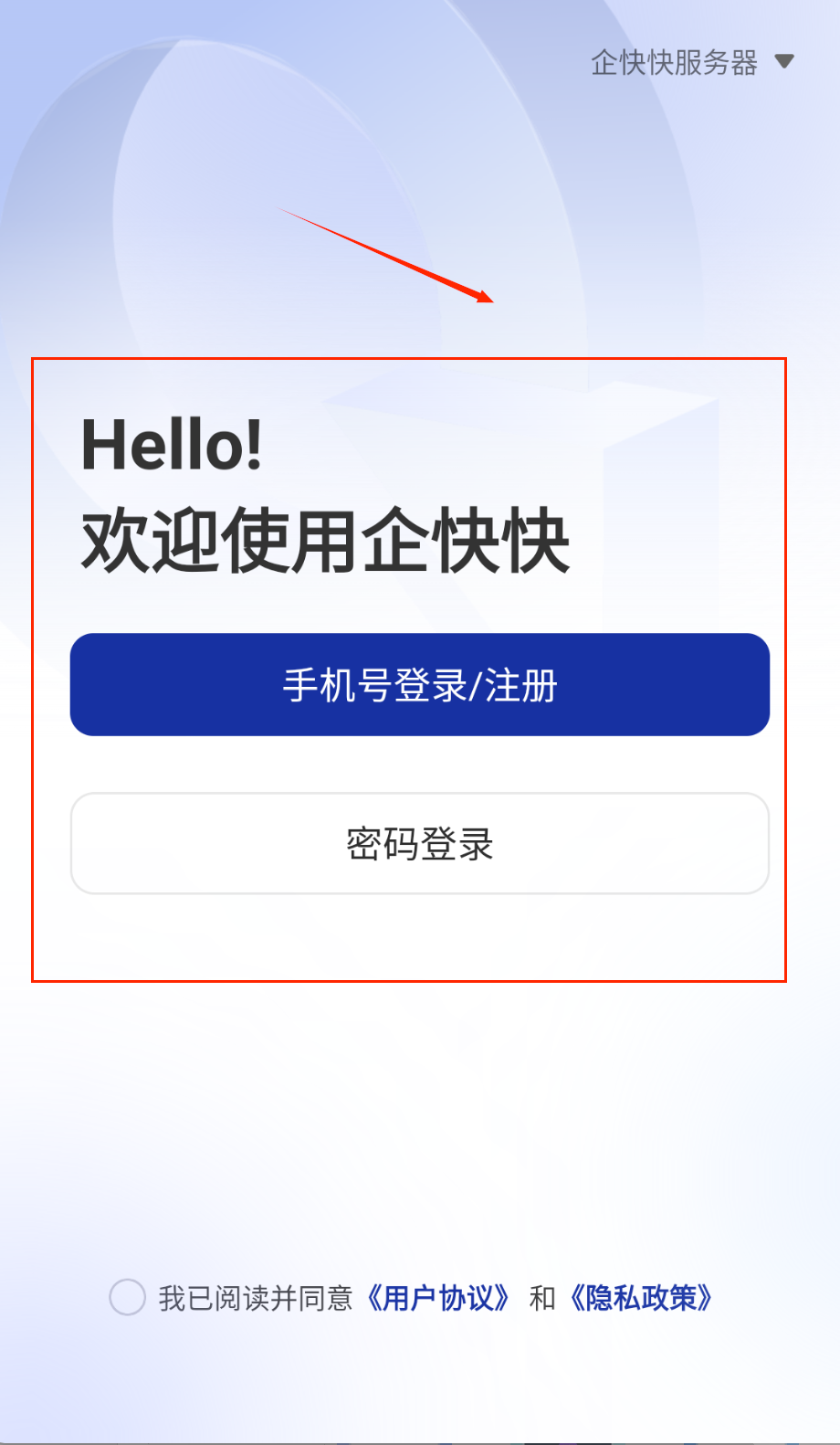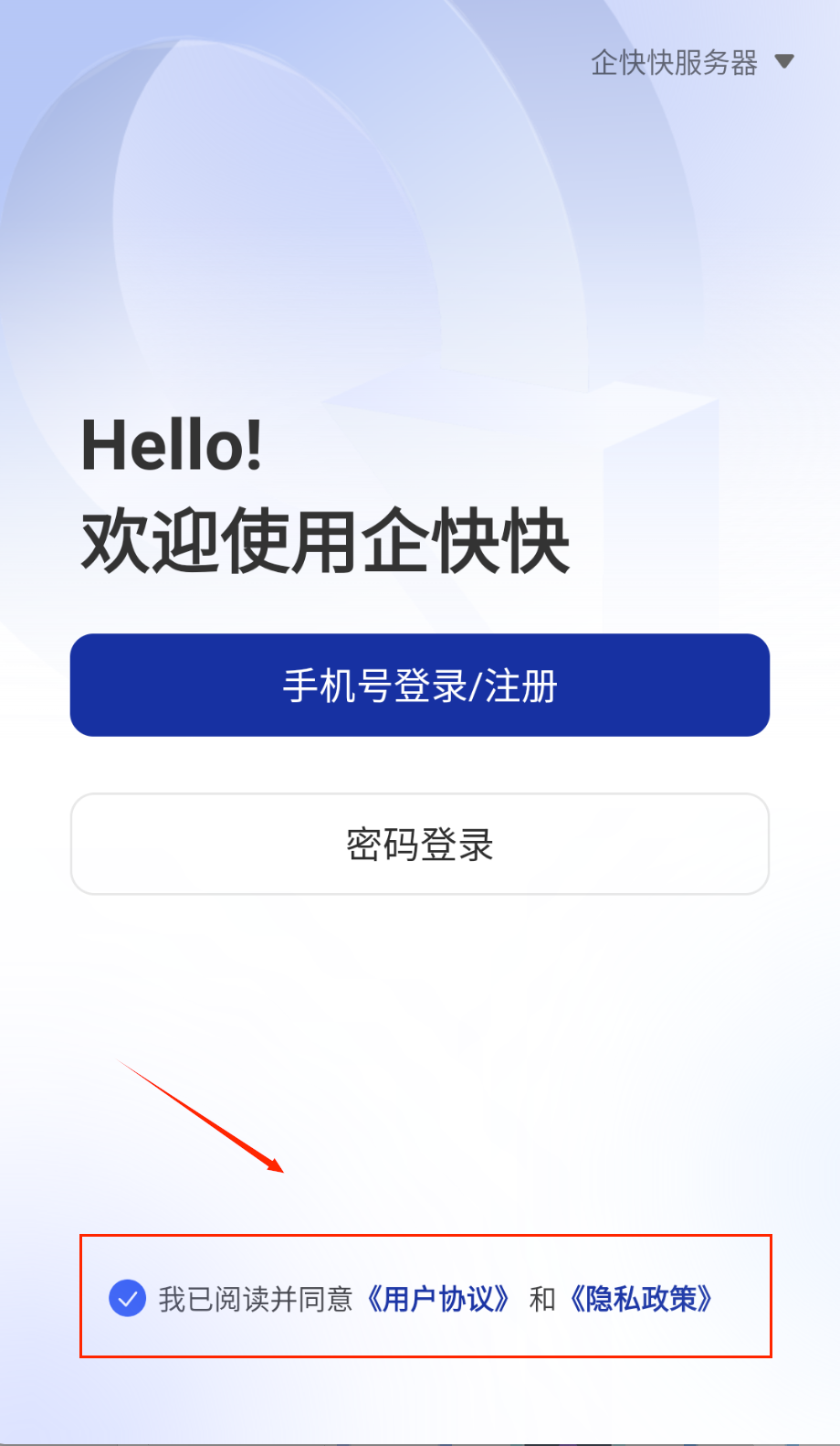 1、打开APP进入欢迎页,顶部显示当前时间和服务器状态,中间是"欢迎使用企快快"问候语呀。点击蓝色"手机号登录/注册"按钮开始操作哦。