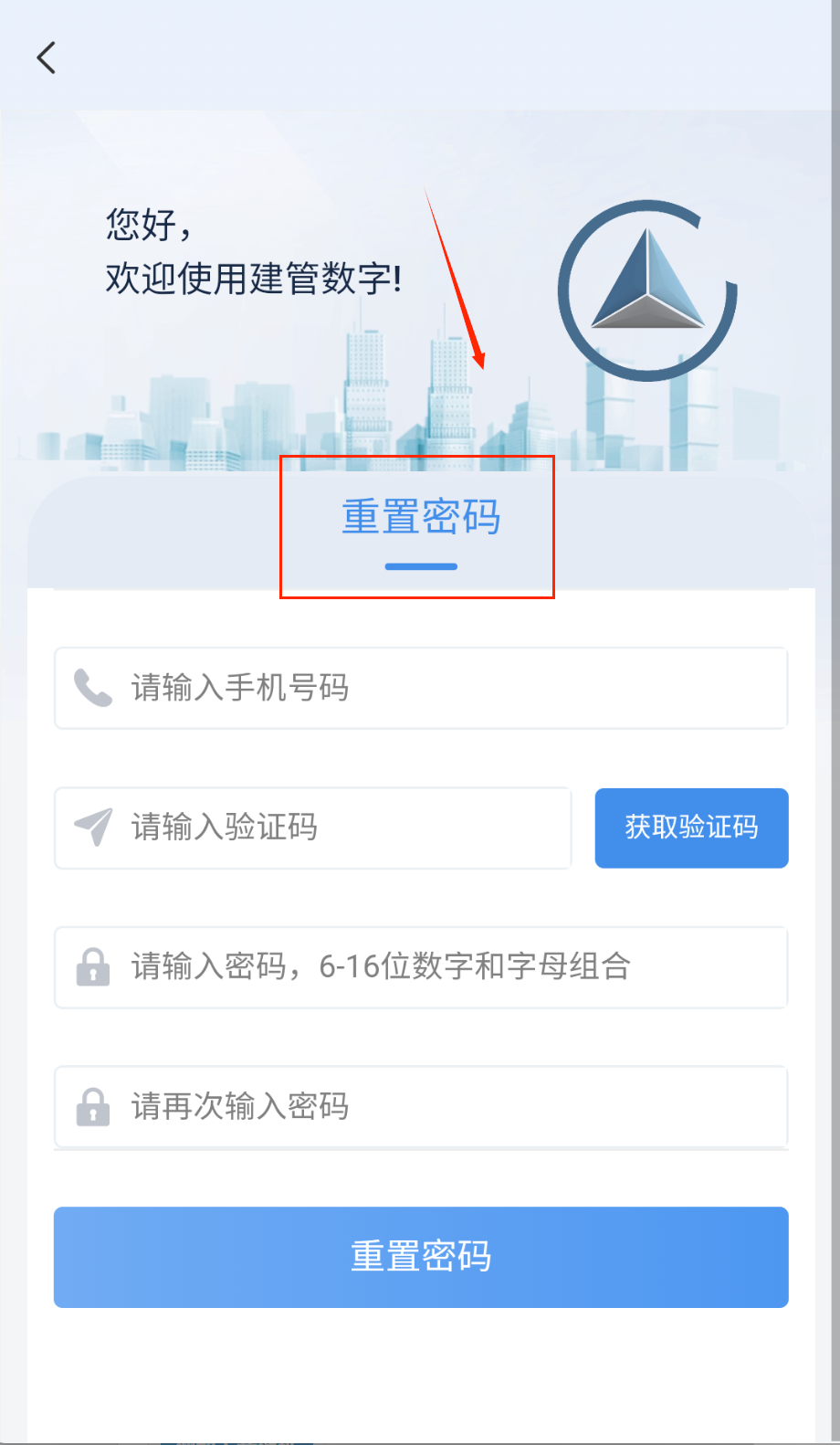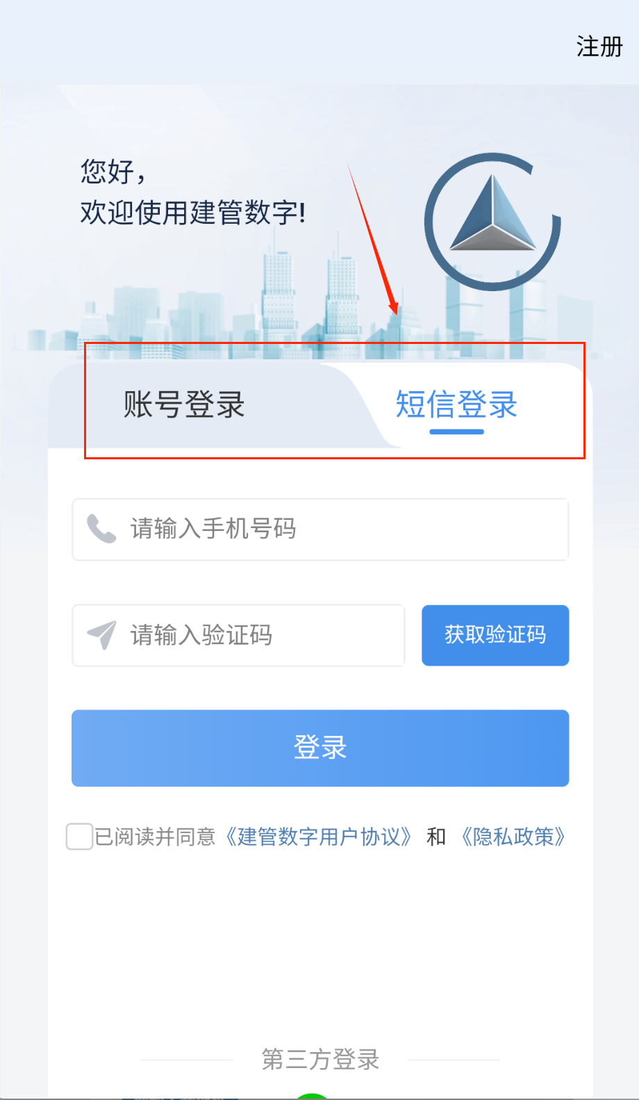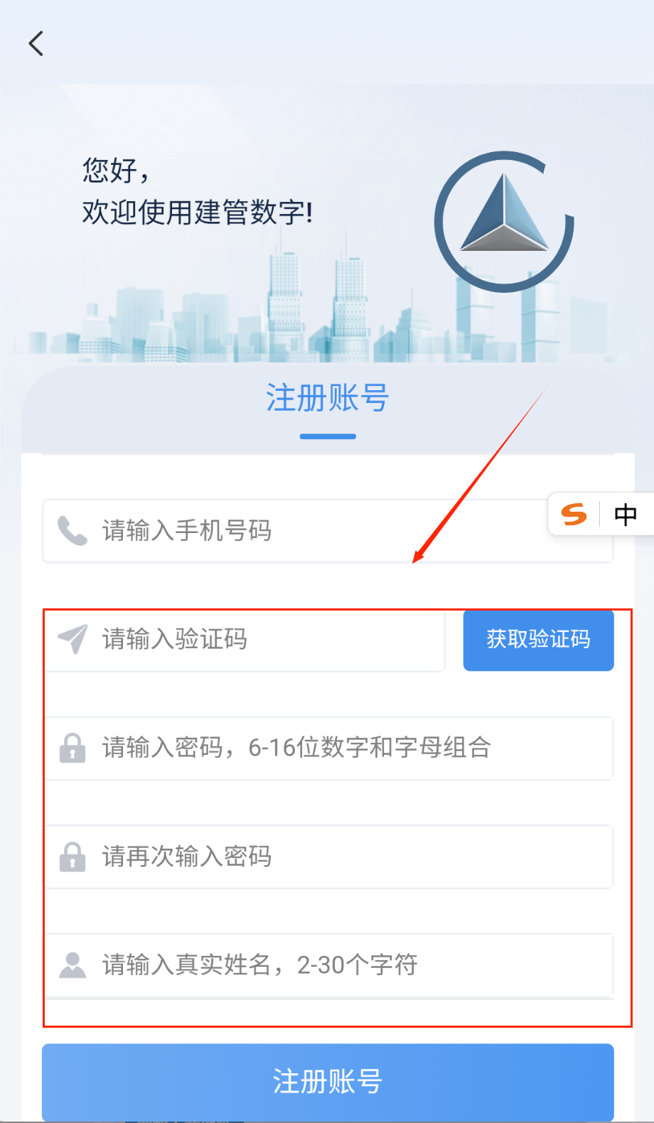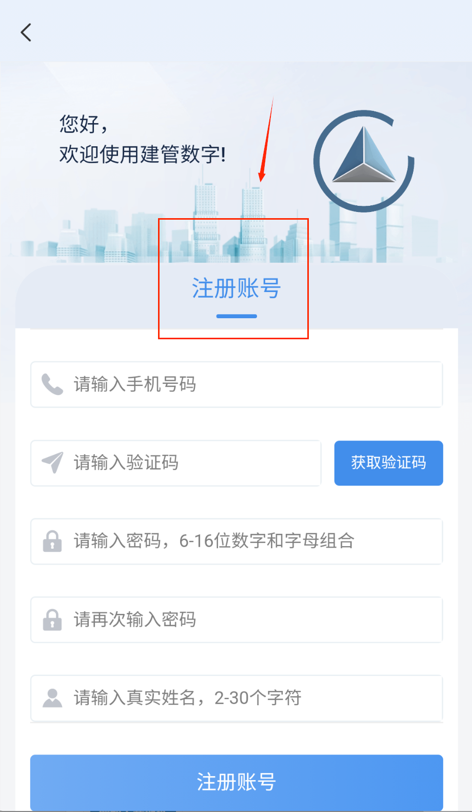 1、打开APP进入登录页,顶部显示时间状态,中间是"您好,欢迎使用建管数字"欢迎语呀。点击"注册账号"进入注册页面哦。