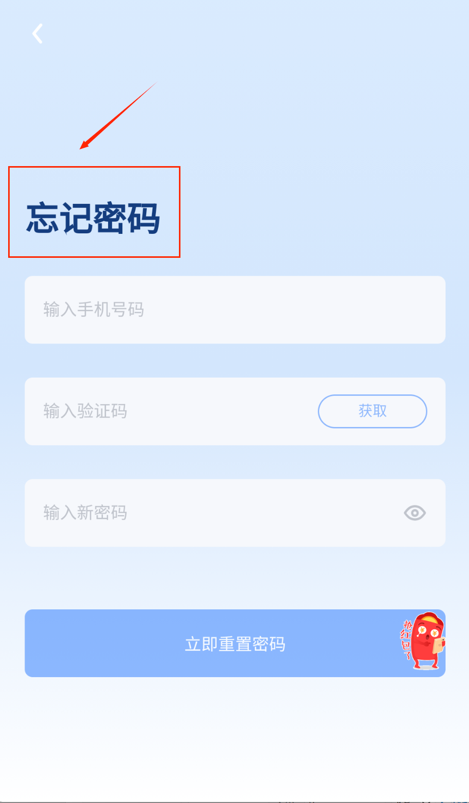 3、忘记密码在登录页点击对应链接,输入注册手机号获取验证码,设置新密码后点击蓝色重置按钮呀。密码需包含字母和数字哦。