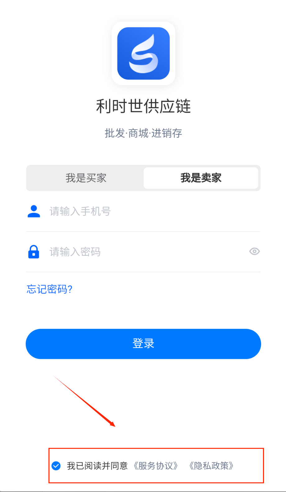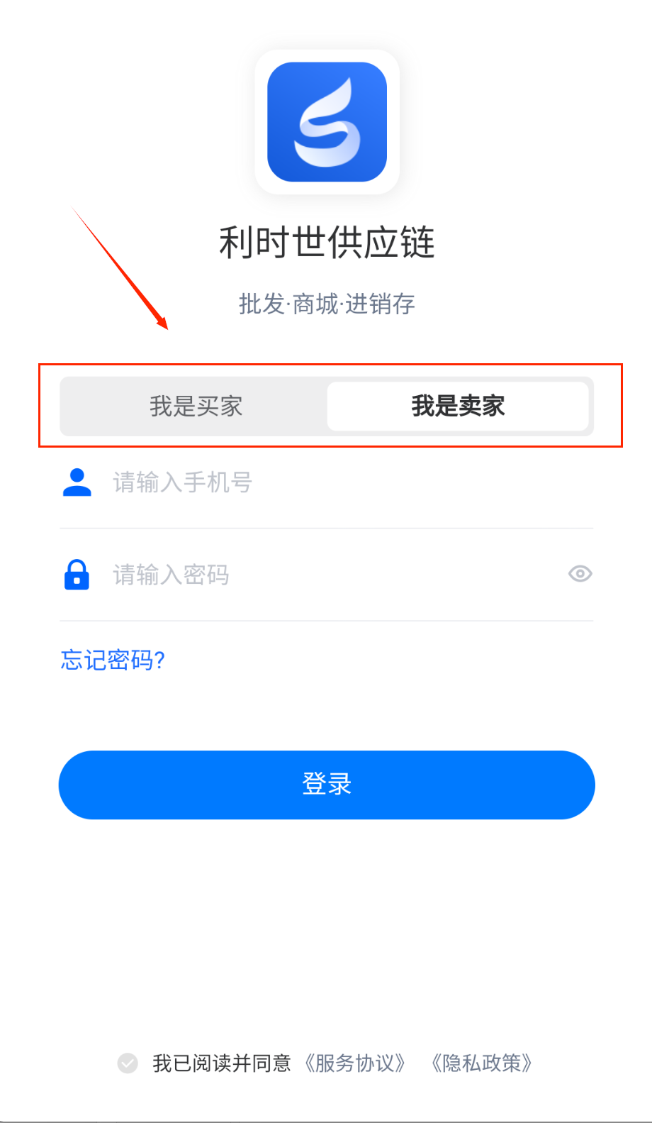 1、打开APP进入登录页,顶部显示"利时世供应链"标题,下方是"我是买家/卖家"选择按钮呀。根据身份点击对应选项哦。
