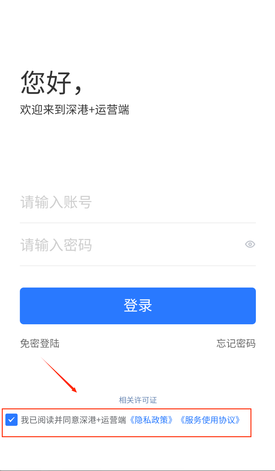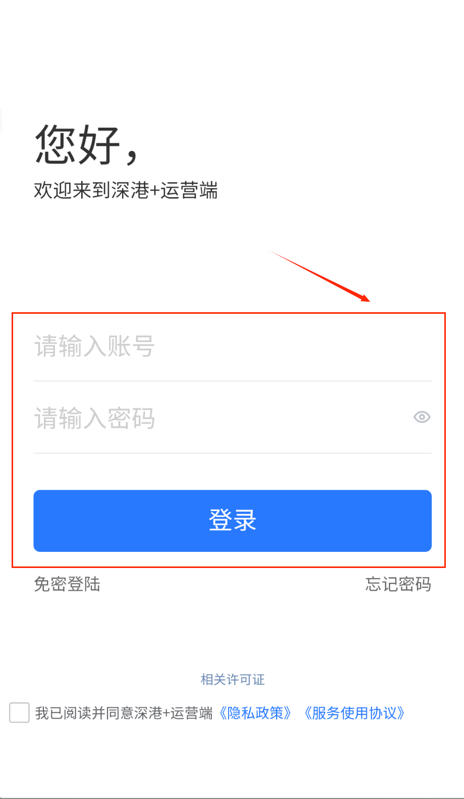 1、打开APP进入登录页,顶部显示"您好,欢迎来到深港+运营端"问候语,下方是账号密码输入框呀。密码框右侧眼睛图标可切换显示哦。