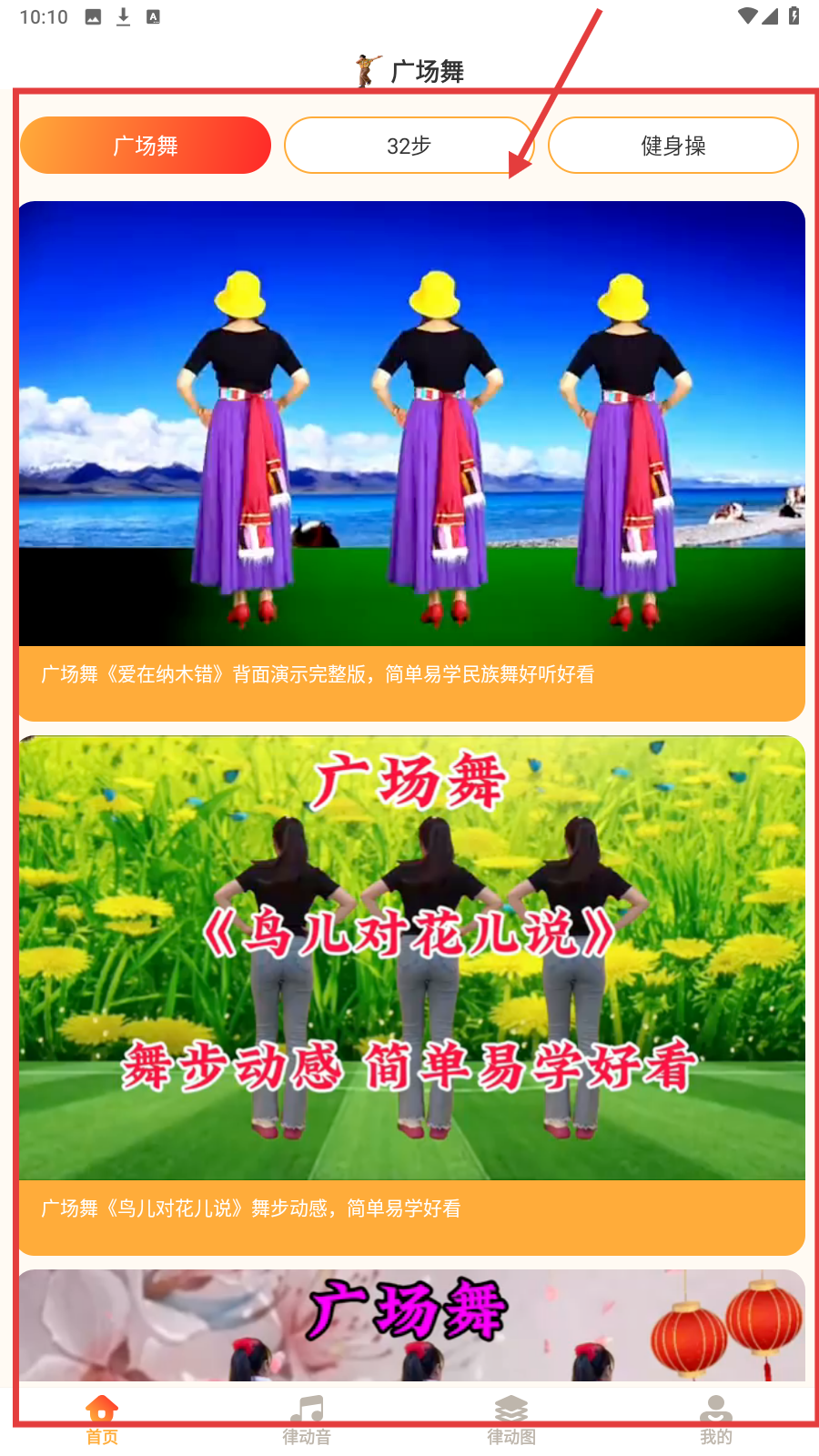 1、打开应用,在【首页】选择感兴趣的广场舞视频,点击进入。