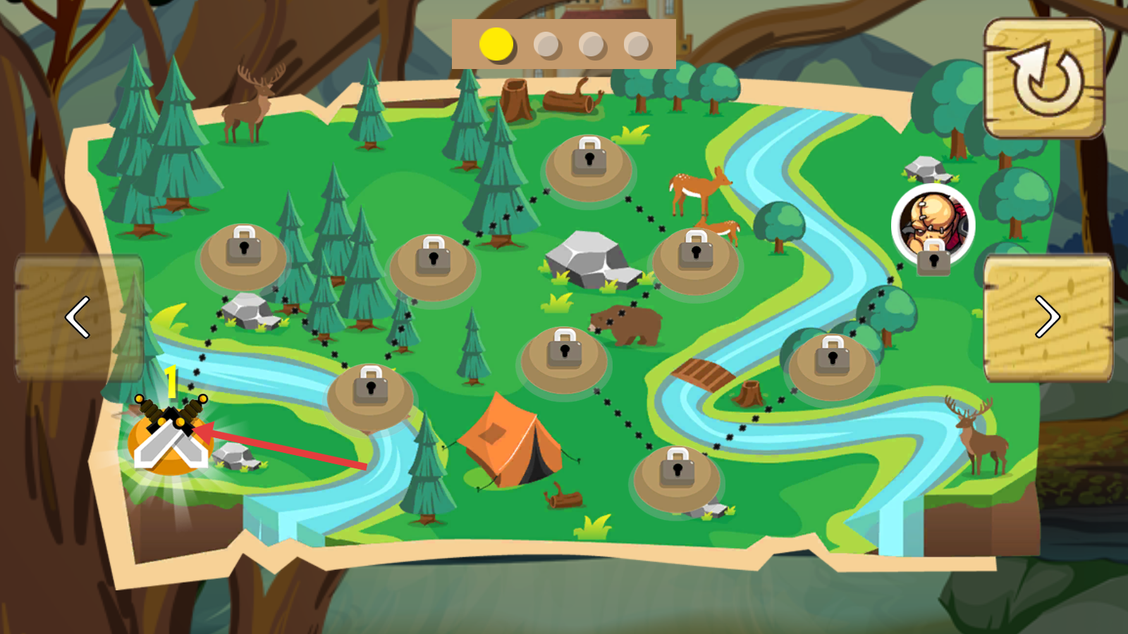 1、点击地图中【双刀-图标】进入第1关,沿河流探索路径,避开带锁区域,优先开启初始可进入的关卡。