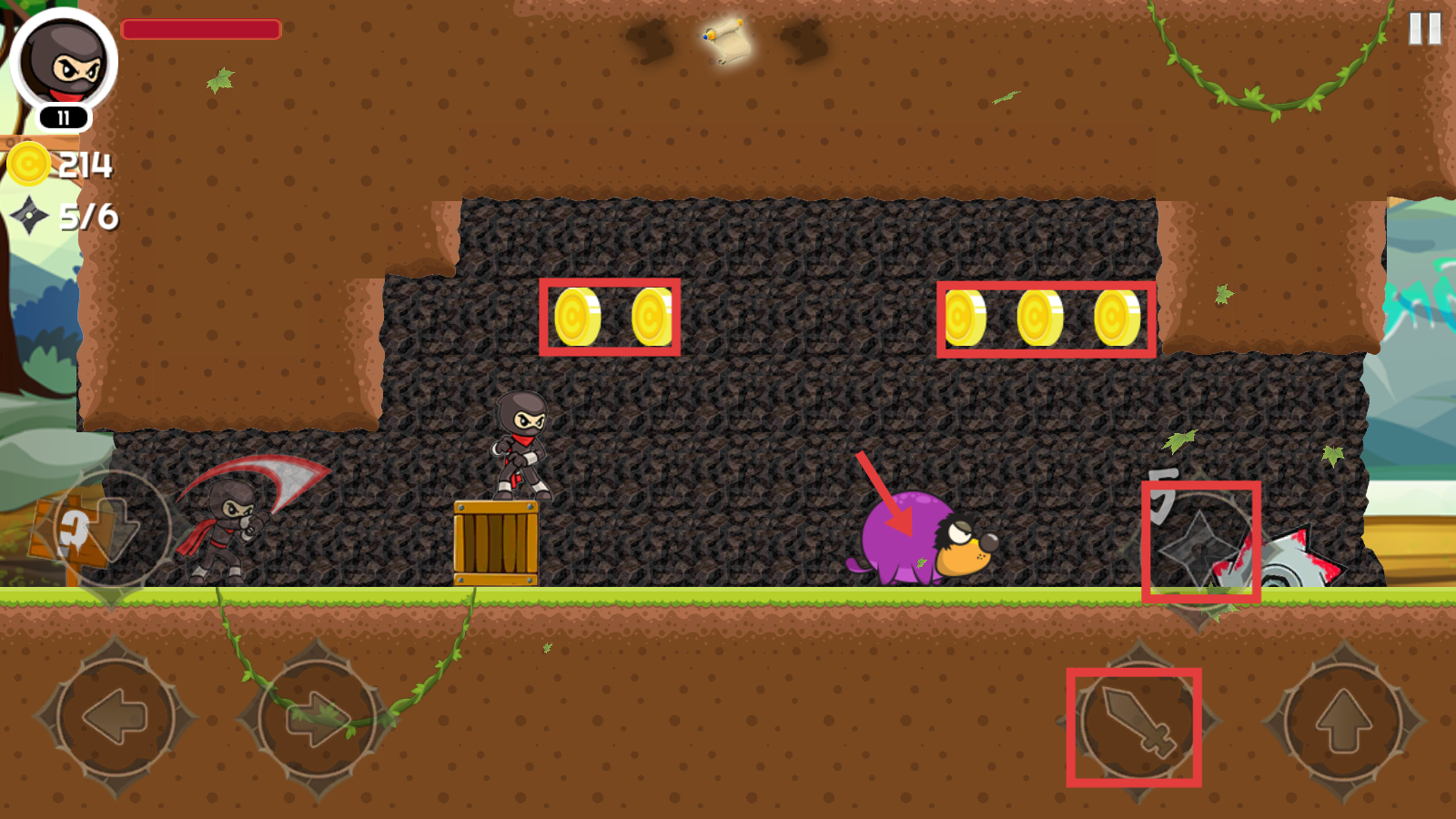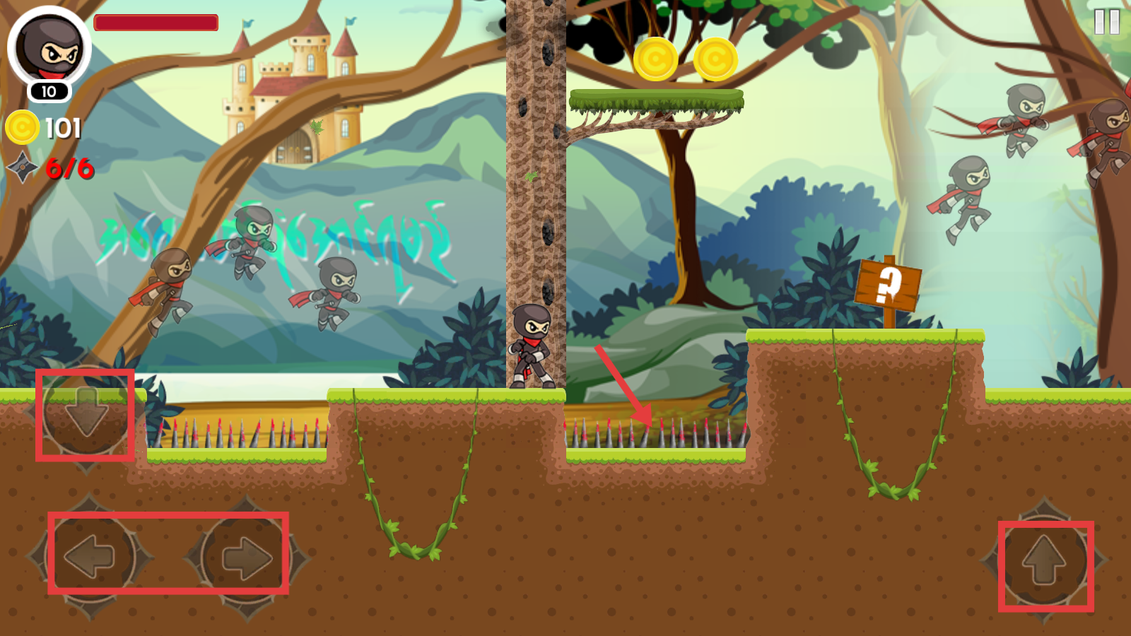 2、操控忍者角色,按【方向键】躲避【尖刺-陷阱】,跳上平台收集【金币-2个】,同时留意空中敌人动向。