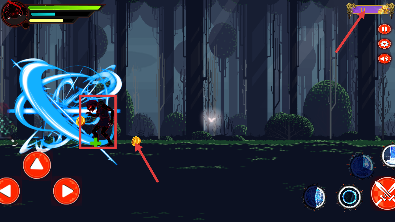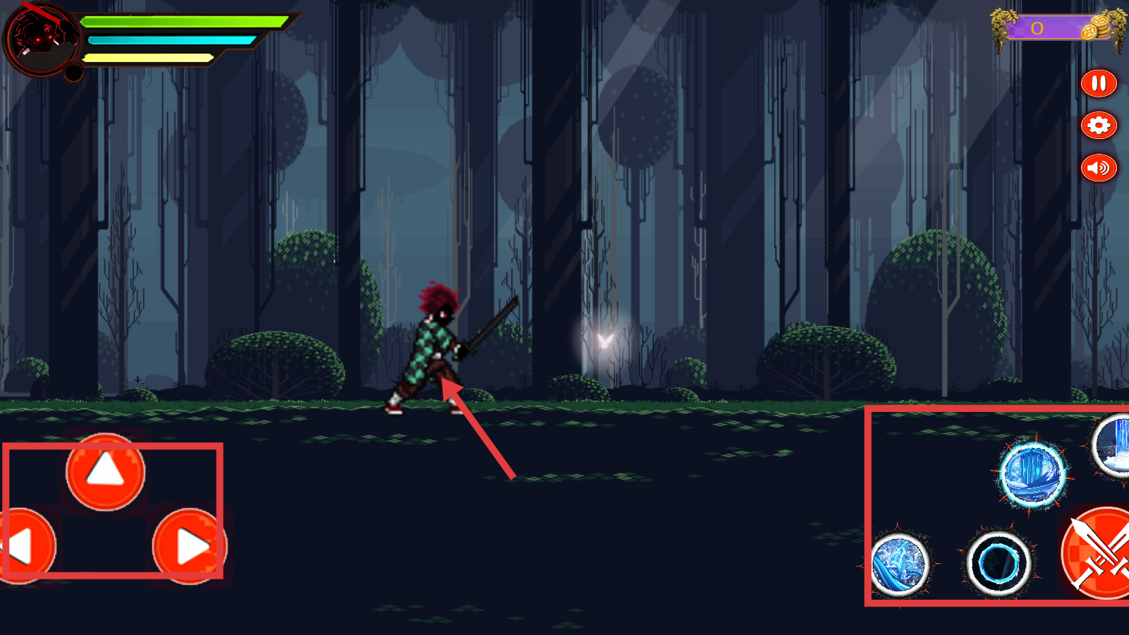 2、操控角色移动,按【方向键】探索森林,点击右侧【技能-按钮】释放招式,应对突发敌人。