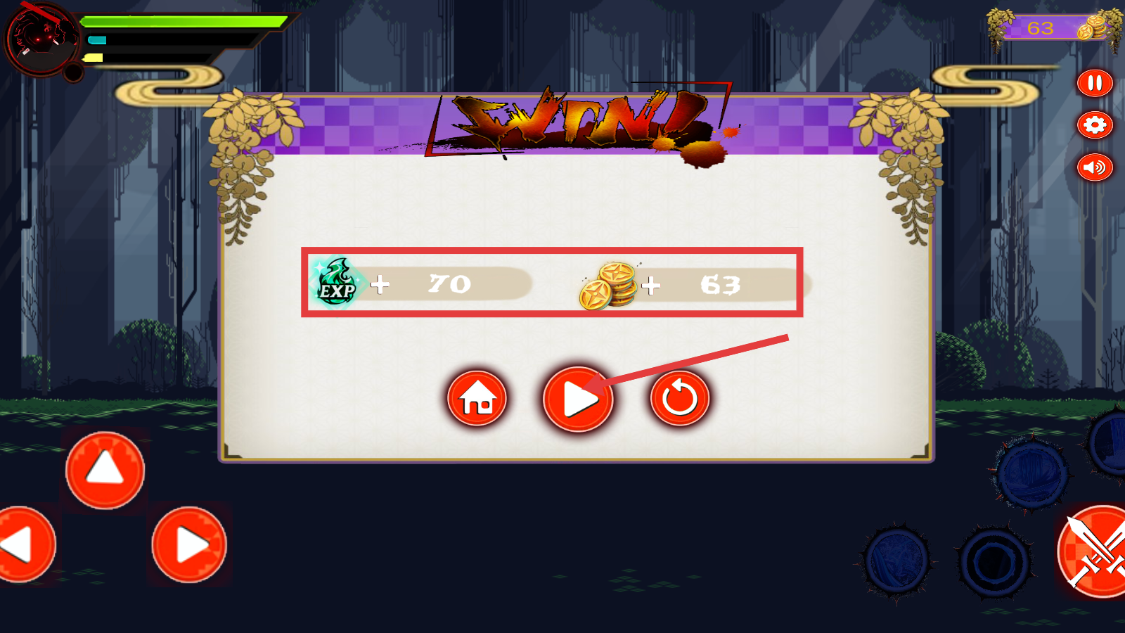 4、通关后领取【EXP-70】与【金币-63】奖励,点击继续按钮,开启下一场战斗,持续积累成长。