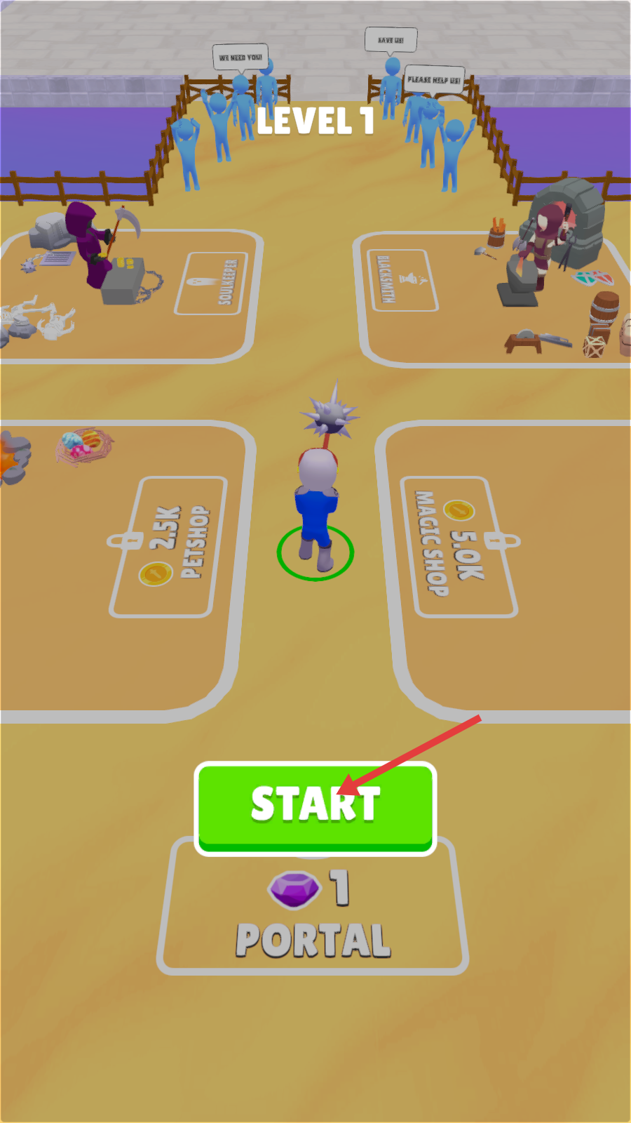1、在【LEVEL-1】界面点击绿色【START】按钮开启关卡,可先熟悉周围【SOULKEEPER】等建筑功能再行动。