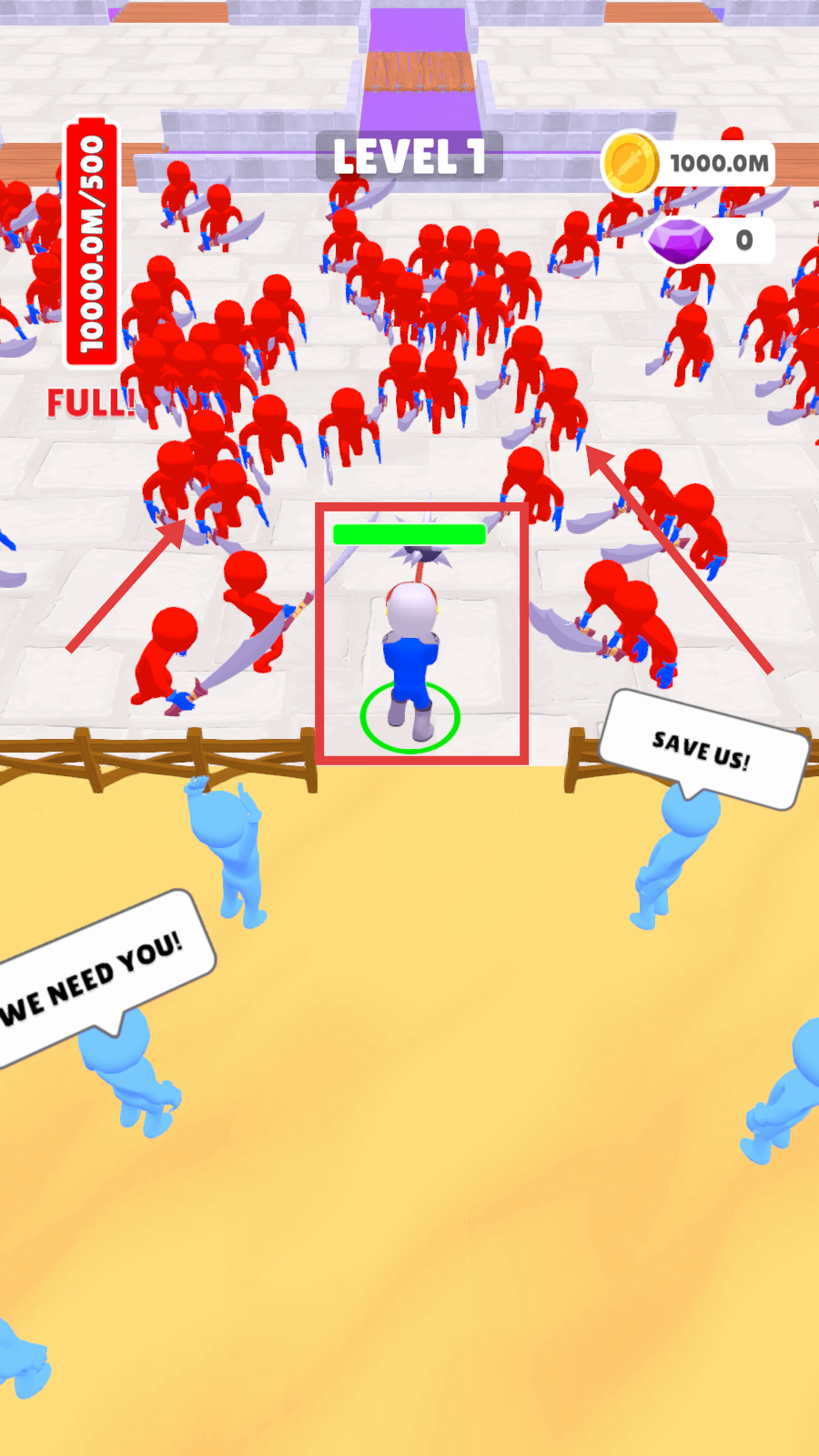 2、进入战斗后,面对大量红色敌人围攻,留意角色的血量和左侧能量条状态,满值时可释放强力技能清场。