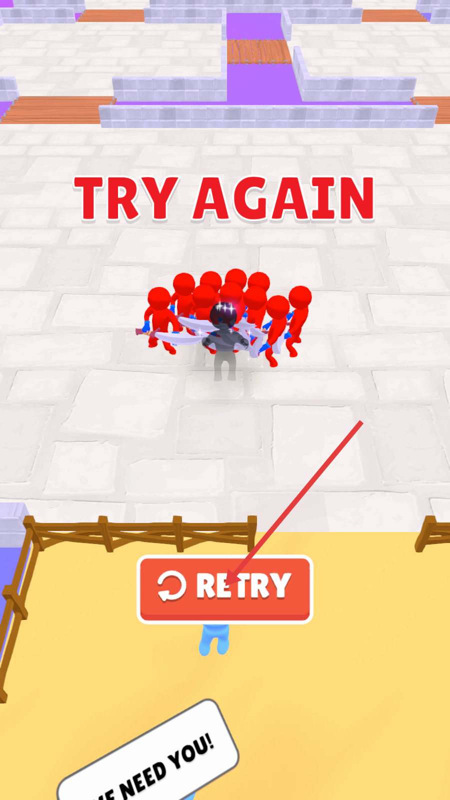 4、若挑战失败,界面出现【TRY-AGAIN】时点击红色【RETRY】按钮,重新开始关卡并调整策略。