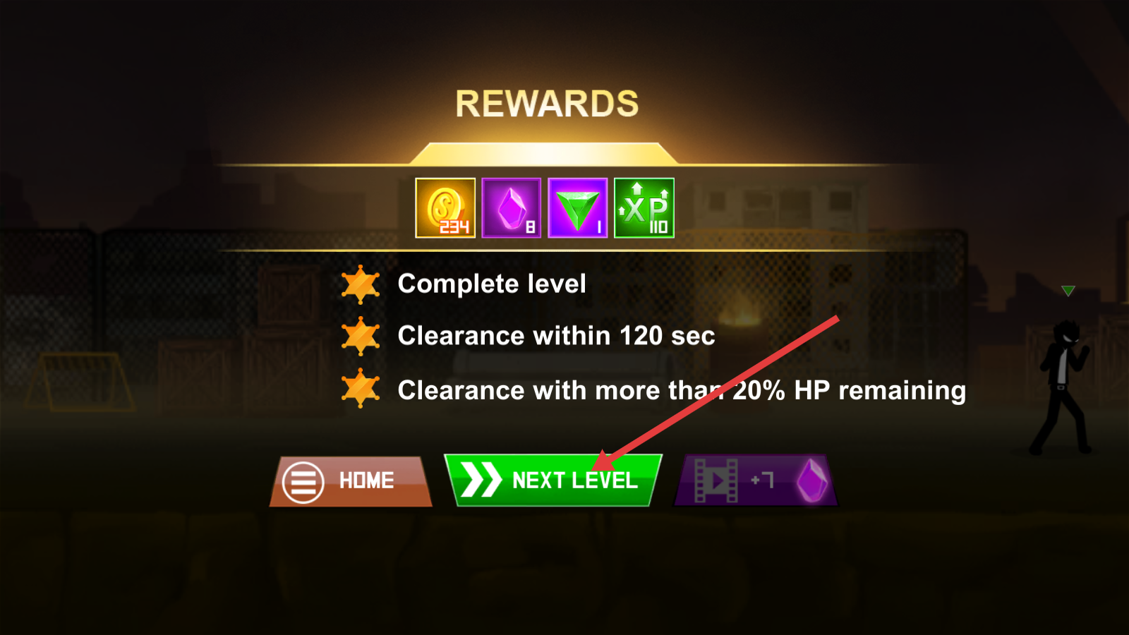 4、通关后在【REWARDS】界面领奖励,点击【NEXT-LEVEL】挑战下一关,积累资源强化角色。