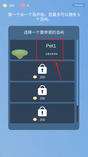 3、在岛屿选择界面随意点击一个250金币的岛屿即可进入。