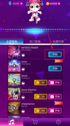 1、在“30/30+ 全部歌曲”列表中点击任意歌曲右侧的“开始”即可选定并加载关卡。