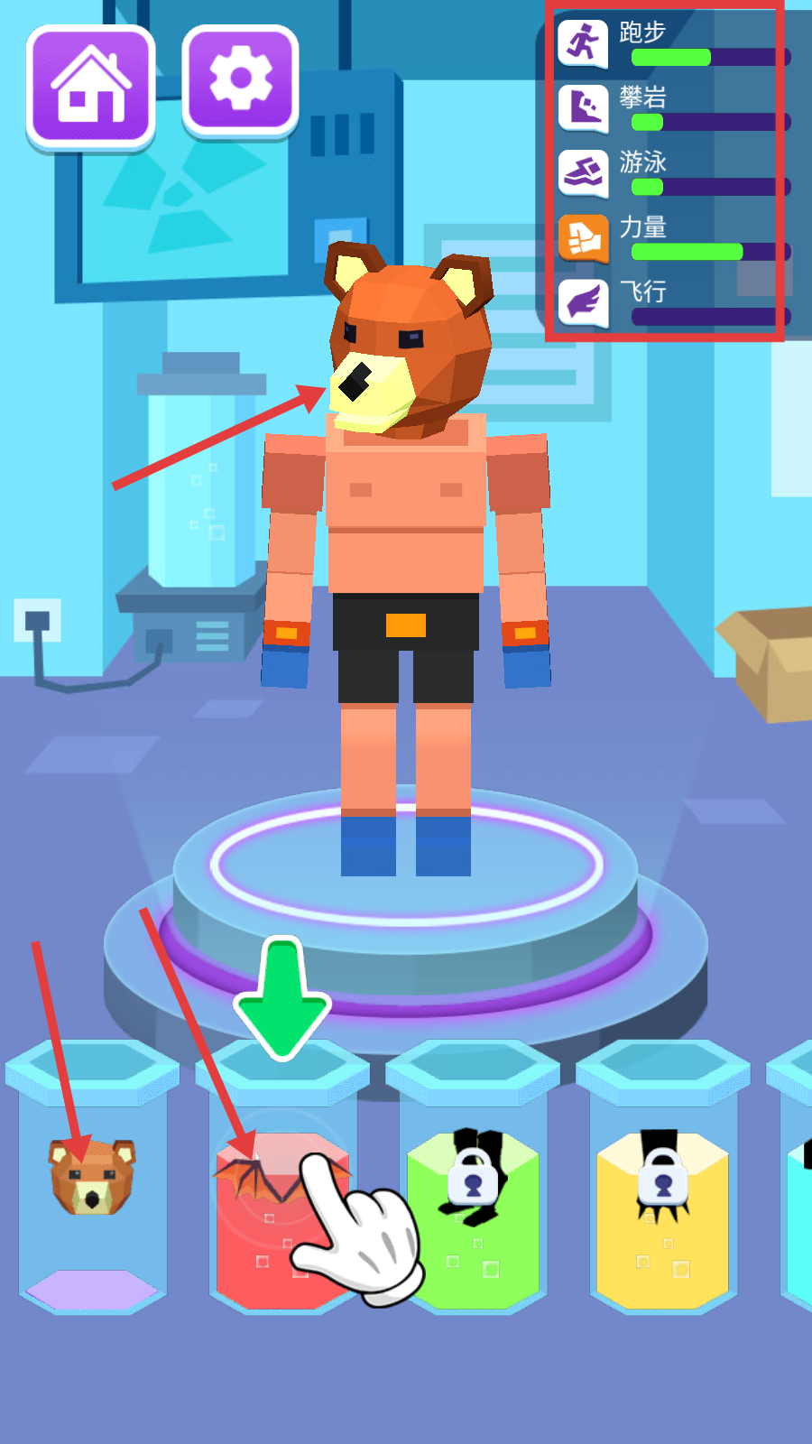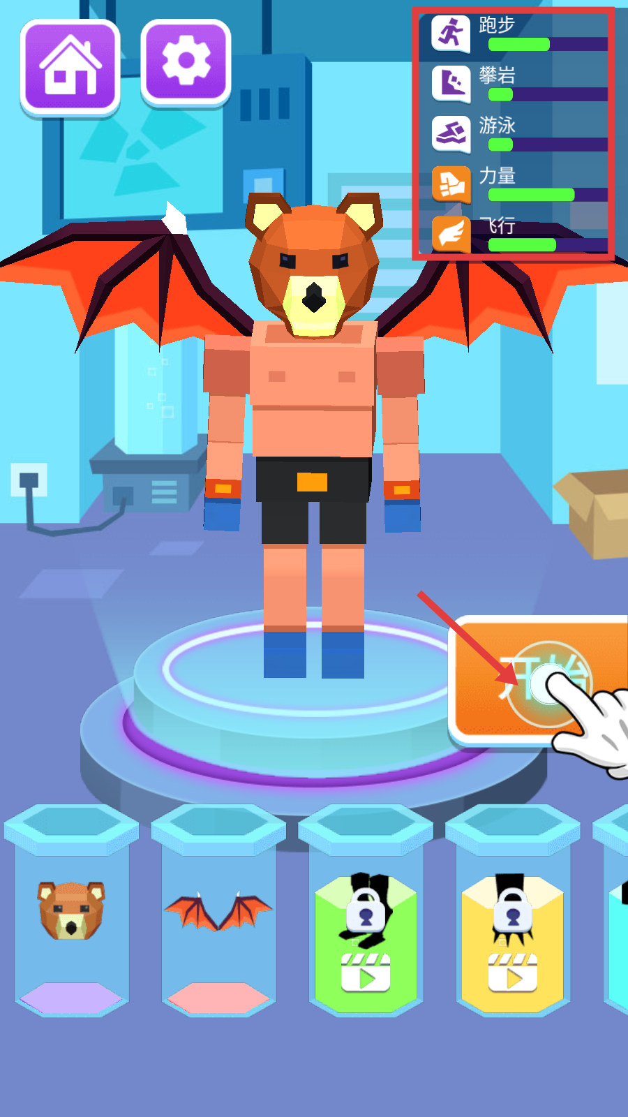 1、在角色界面选熊头部件装备,搭配翅膀提升【飞行】属性,同时关注【跑步】等其余能力数值变化。