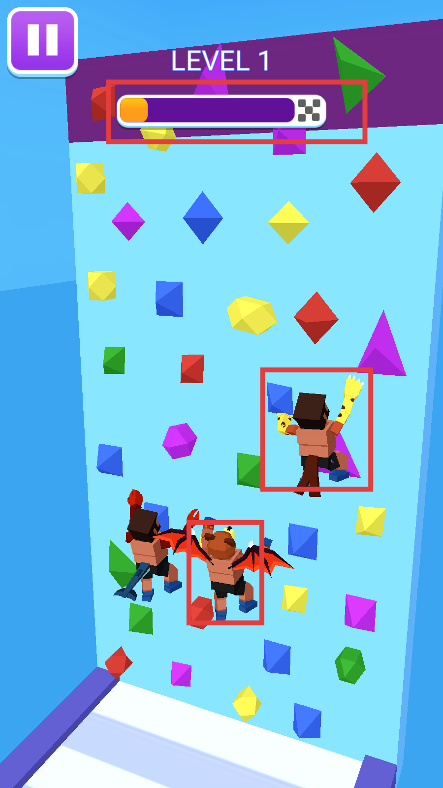 3、在【LEVEL-1】攀岩关卡,操控角色抓取彩色方块,留意上方进度条,保障移动效率推进关卡。
