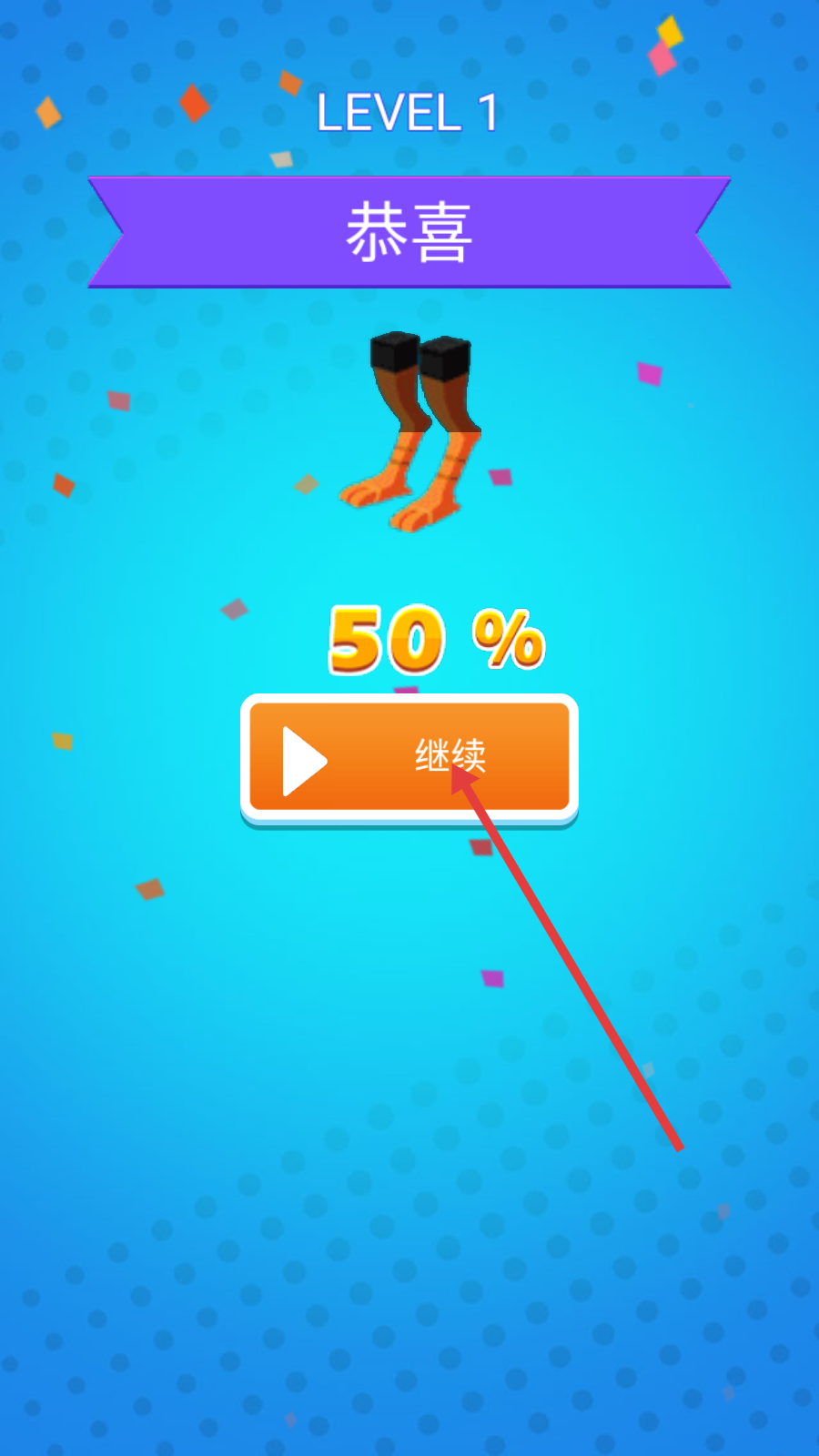 4、通关【LEVEL-1】后点橙色【继续】按钮,领取腿部部件奖励,为后续关卡积累装备提能力。