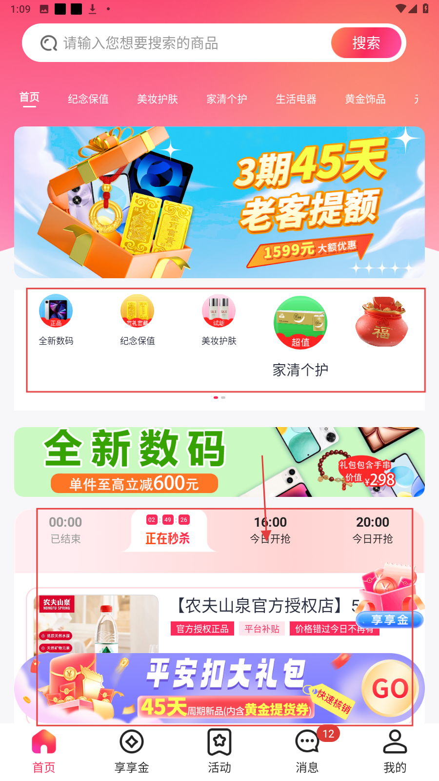 1、首页选商品分类(如全新数码),找到目标商品(农夫山泉)。