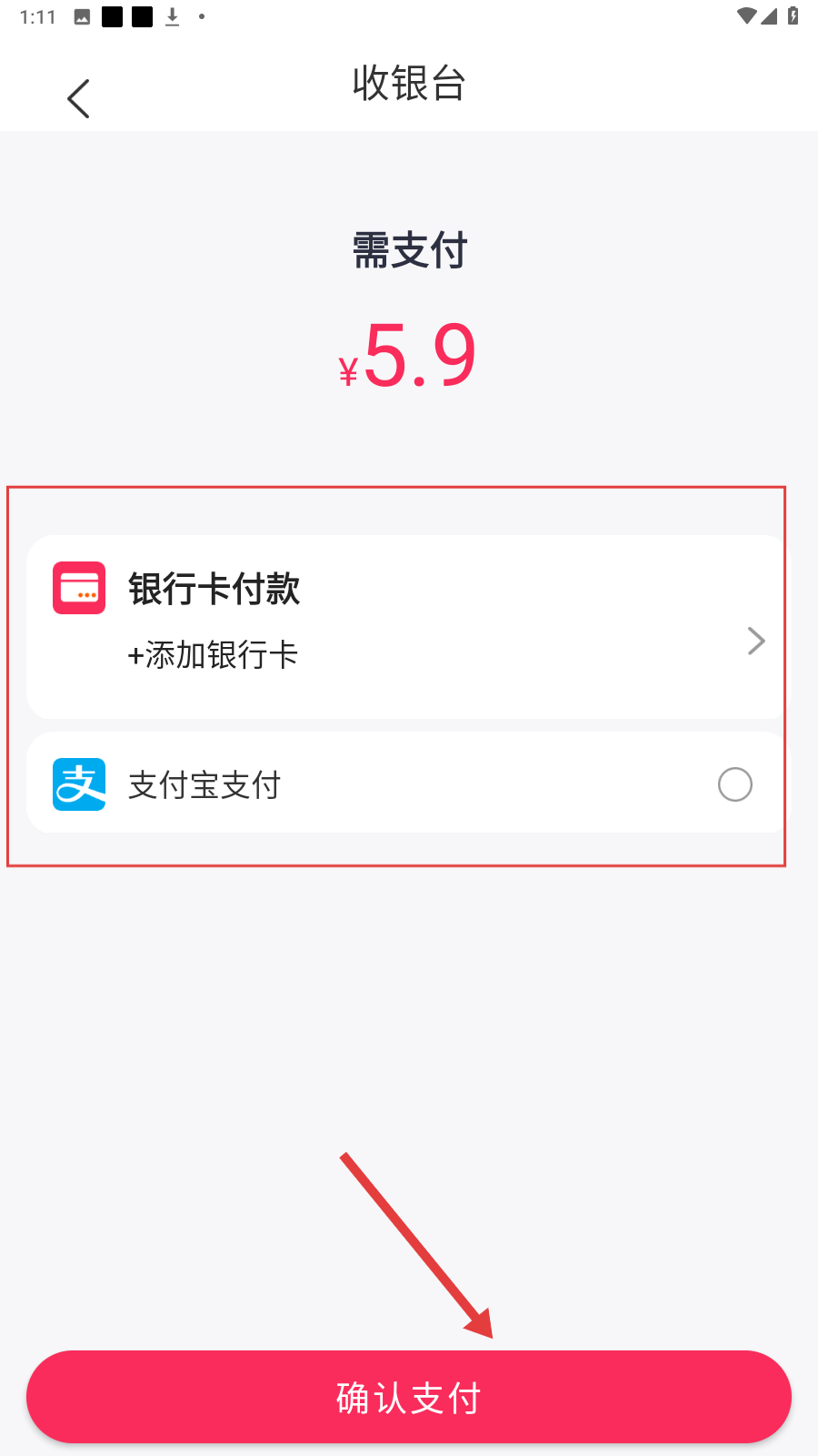 4、收银台选支付方式(银行卡/支付宝),点【确认支付】。