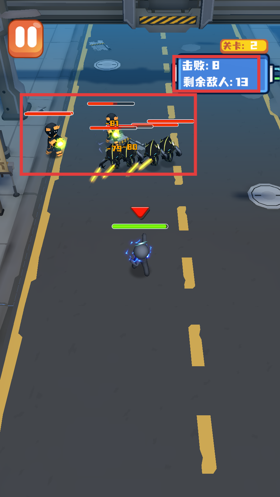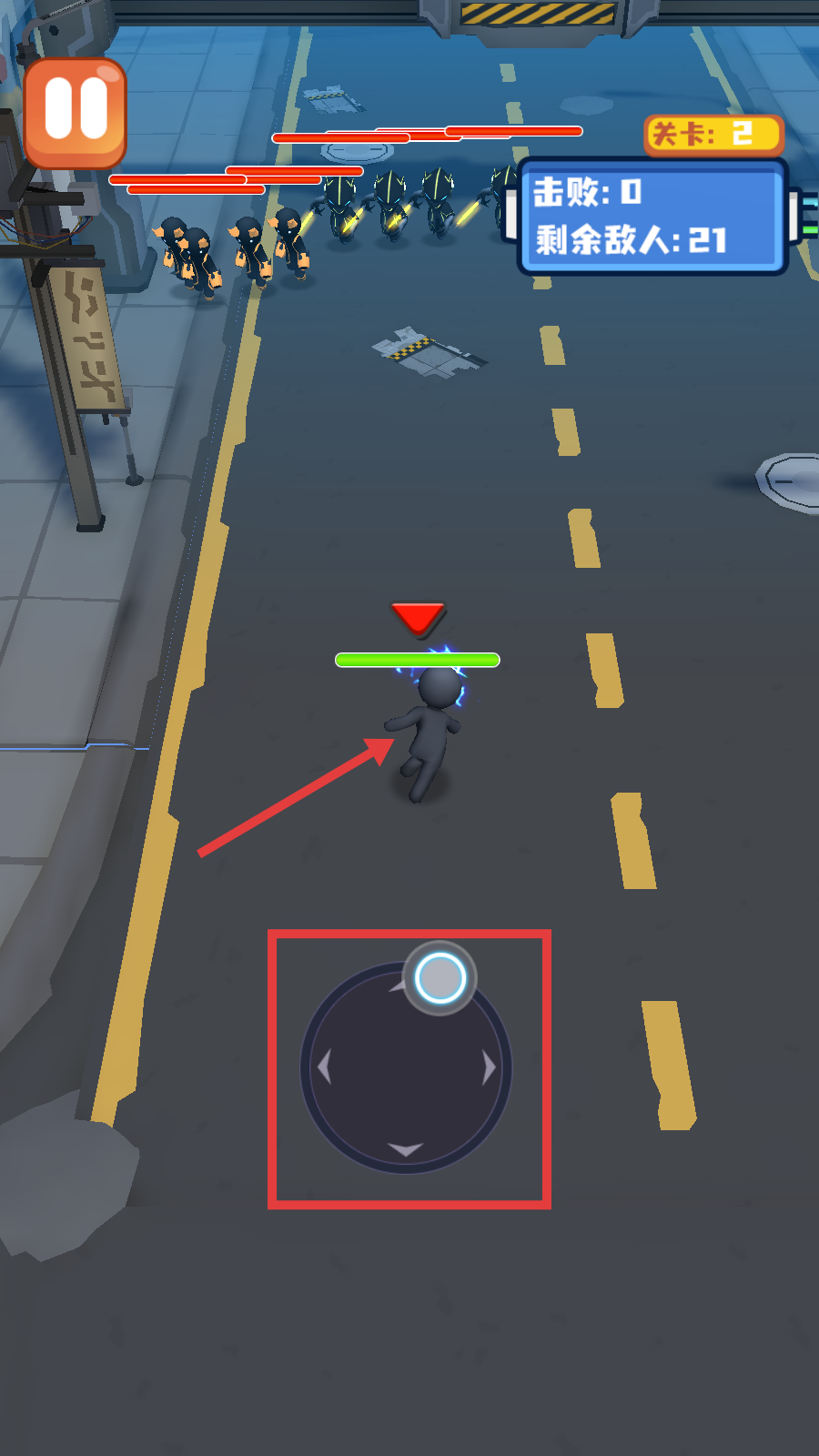 2、通过【虚拟摇杆】操控角色移动,面对【剩余敌人-21】的攻势,灵活走位可规避伤害。