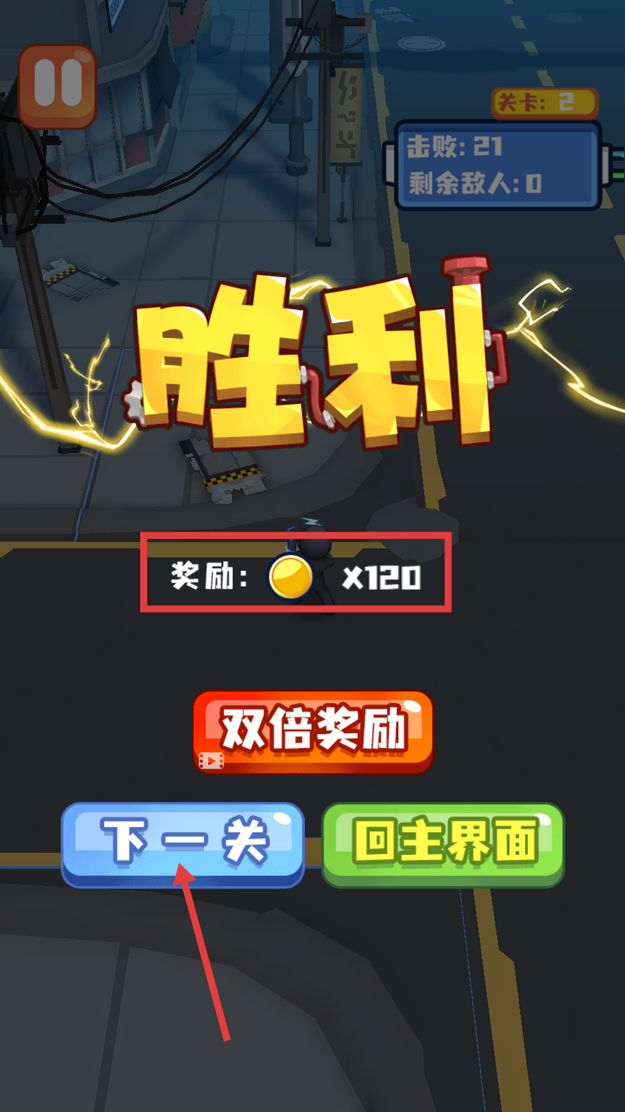 4、胜利后获取【奖励-金币×120】,点击【下一关】按钮,即可继续挑战后续关卡。