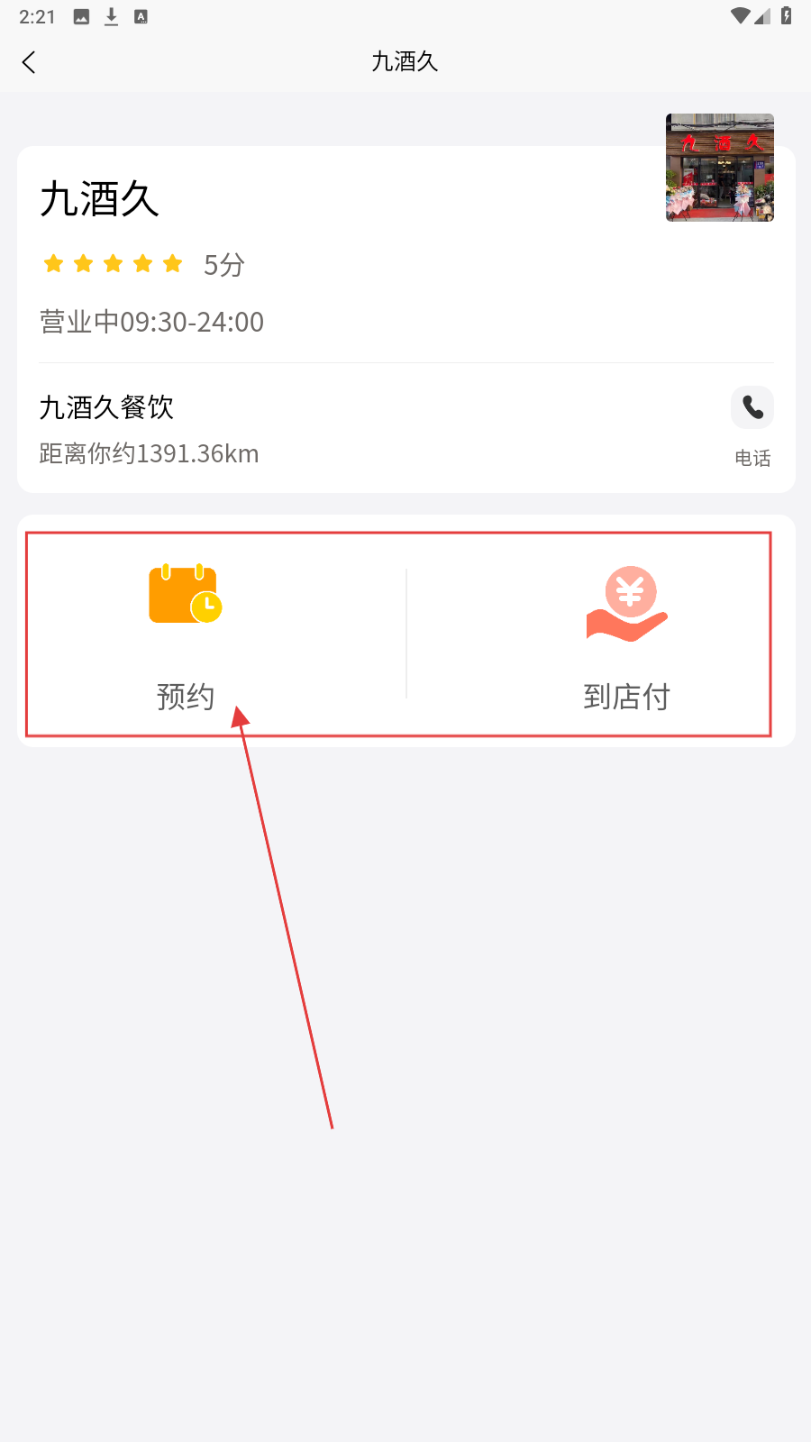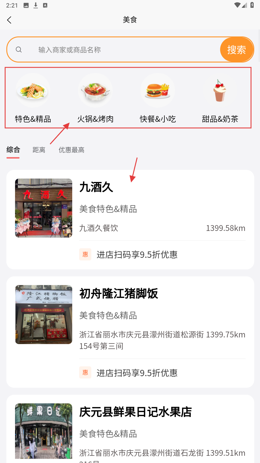 2、在美食列表,选目标商家(九酒久)进入详情页。