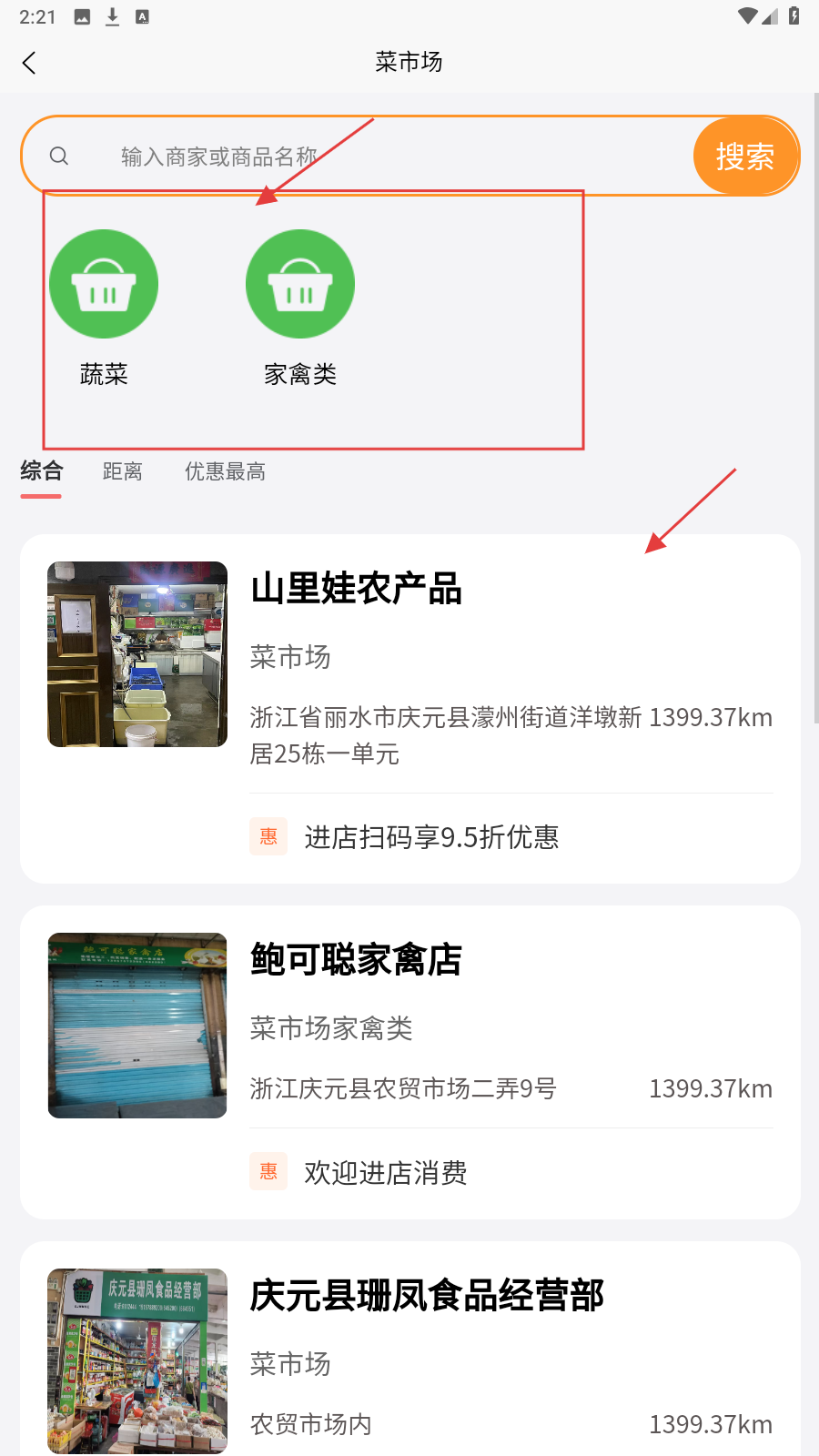 4、若逛菜市场,首页选【菜市场】,按分类(蔬菜/家禽类)找商家。