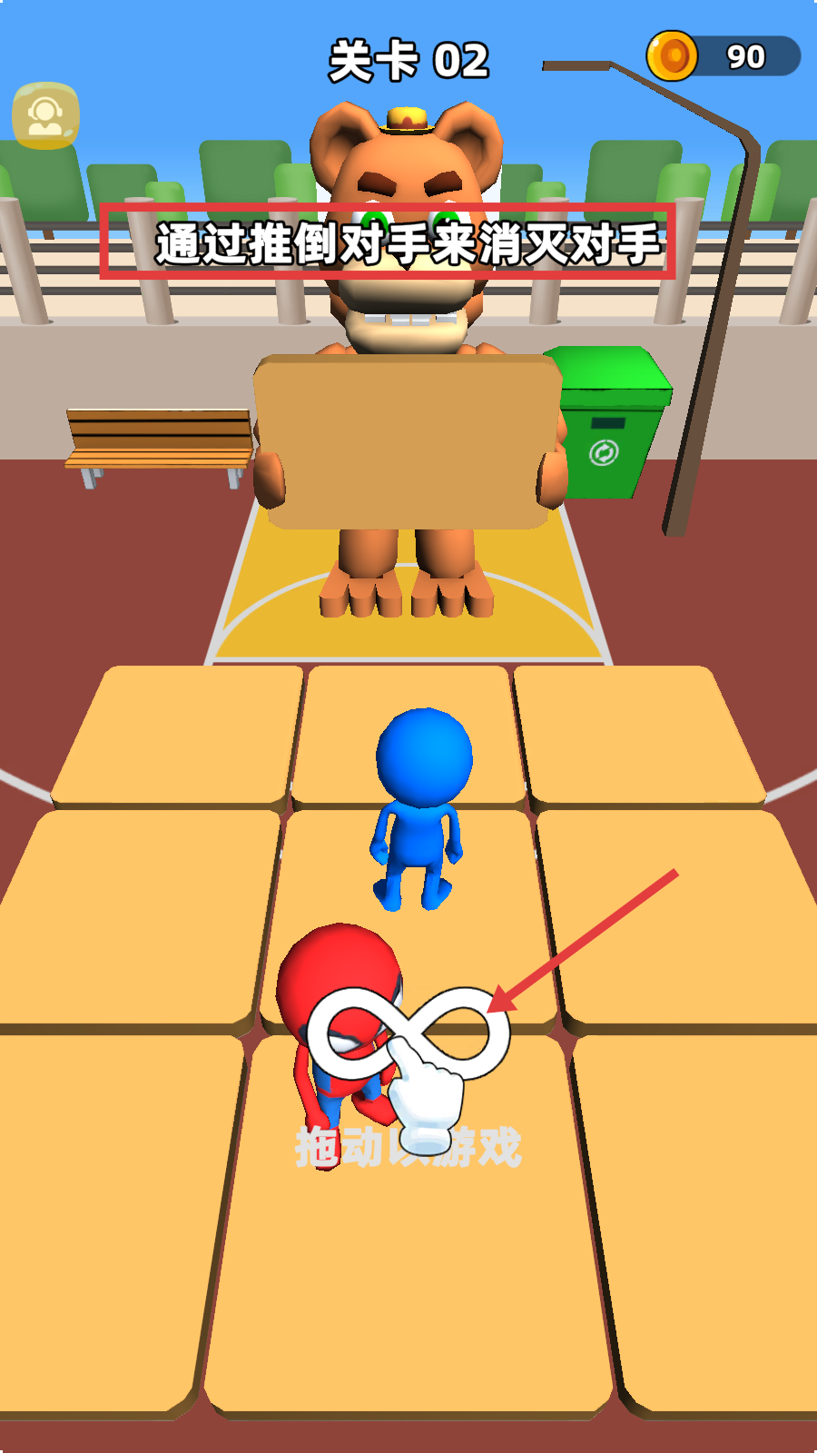 2、本关规则为【通过推倒对手来消灭对手】,需【拖动-角色】移动,借操作击败对手推进关卡。