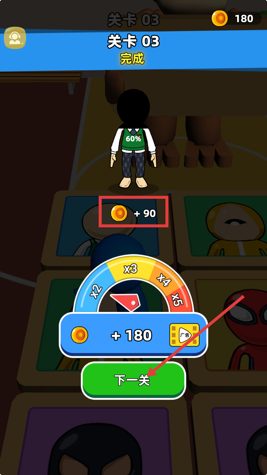 4、完成【关卡03】后获【金币+90】奖励,点击【绿色-下一关】按钮即可挑战后续关卡。