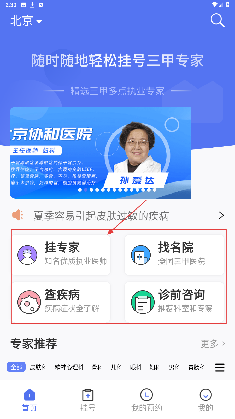 1、首页点【挂专家】,进入查找医生页选目标专家(赵广)。