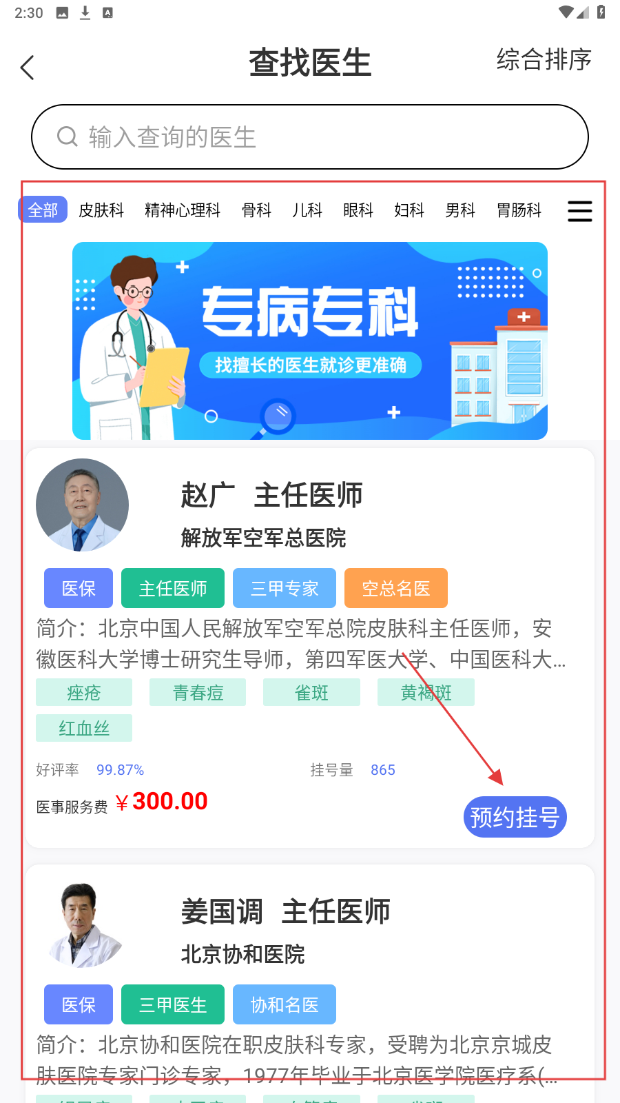 2、医生列表找到赵广,点【预约挂号】进详情页。