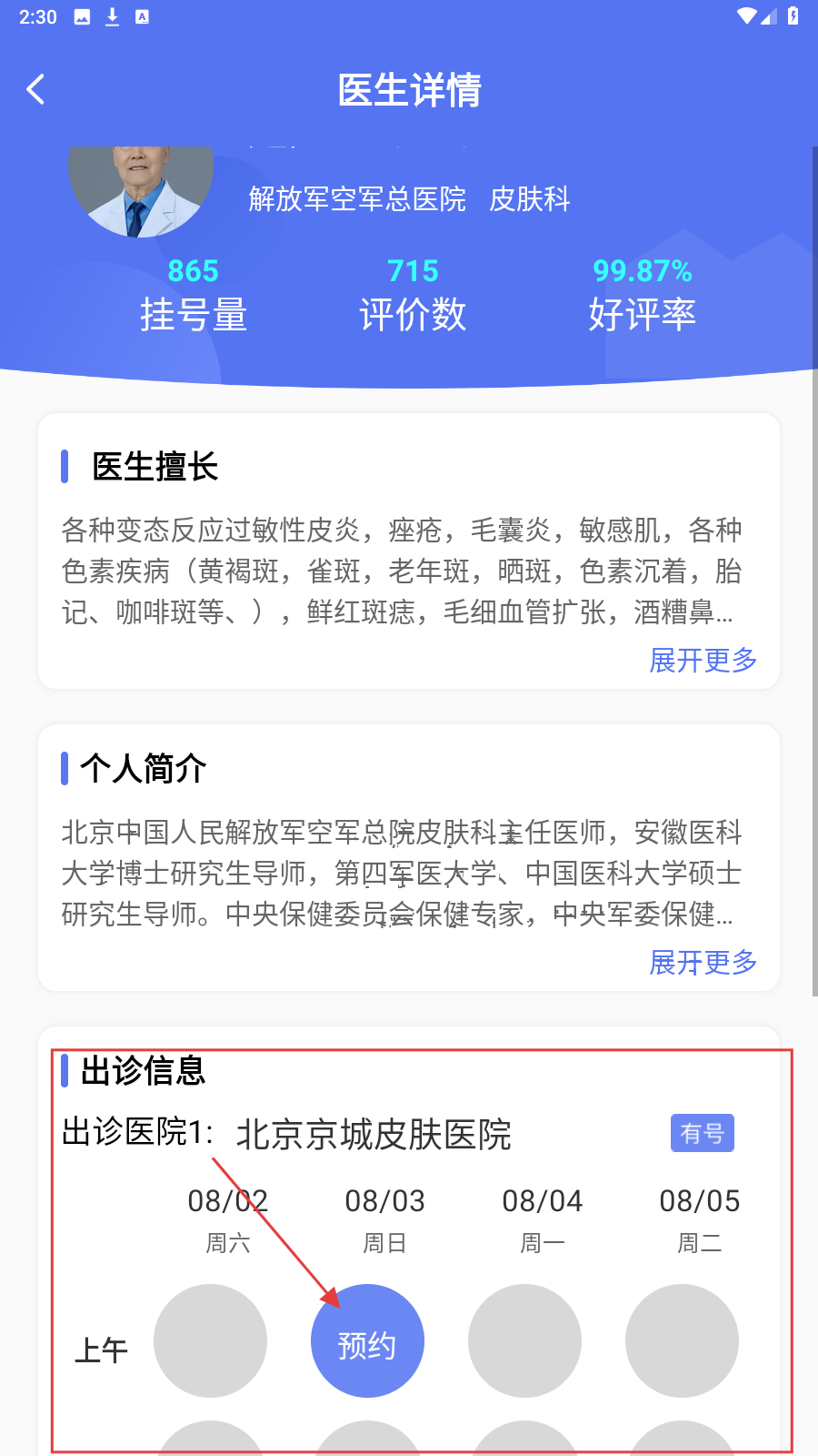 3、医生详情页选出诊信息(如08/03上午),点【预约】。