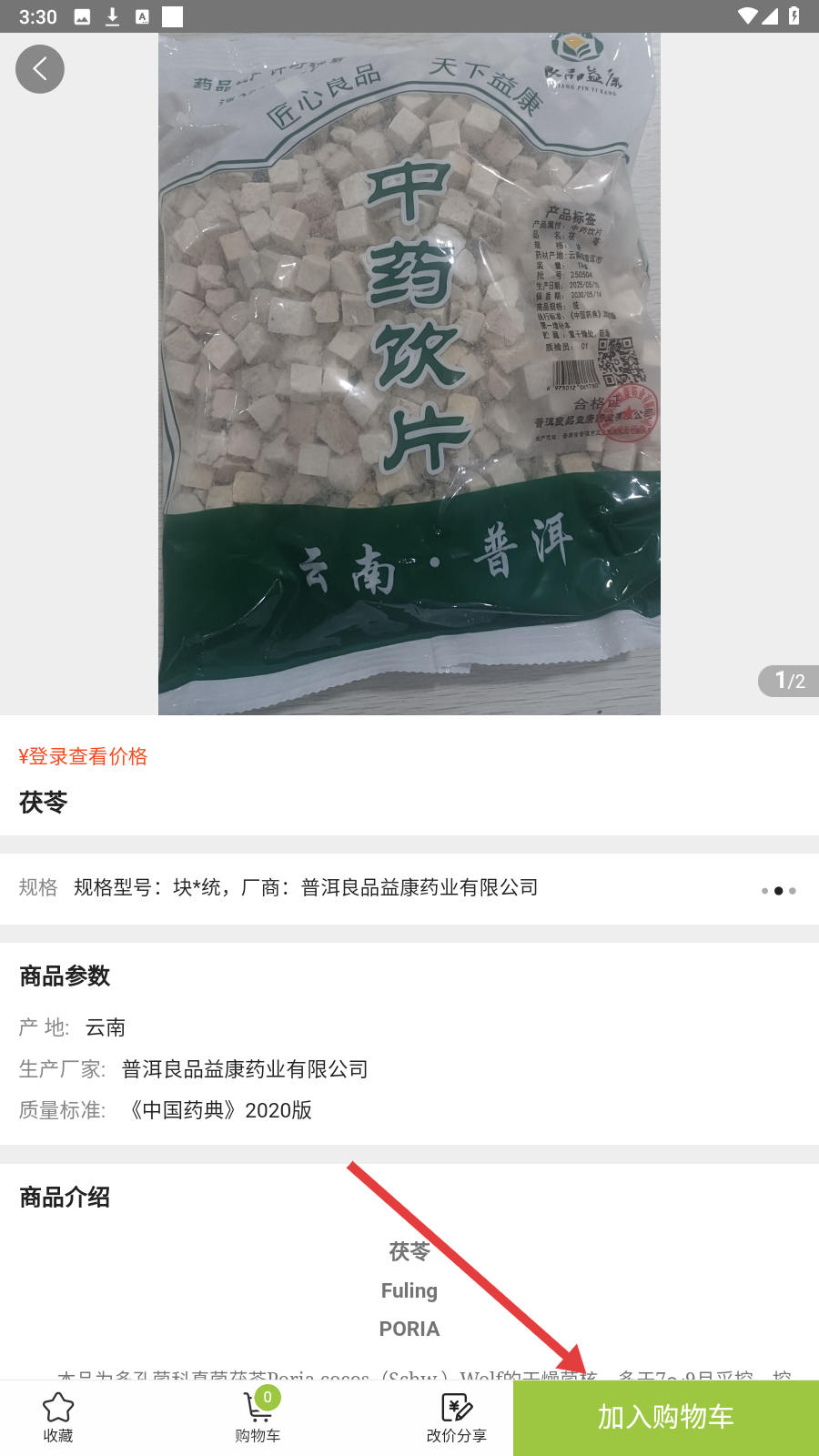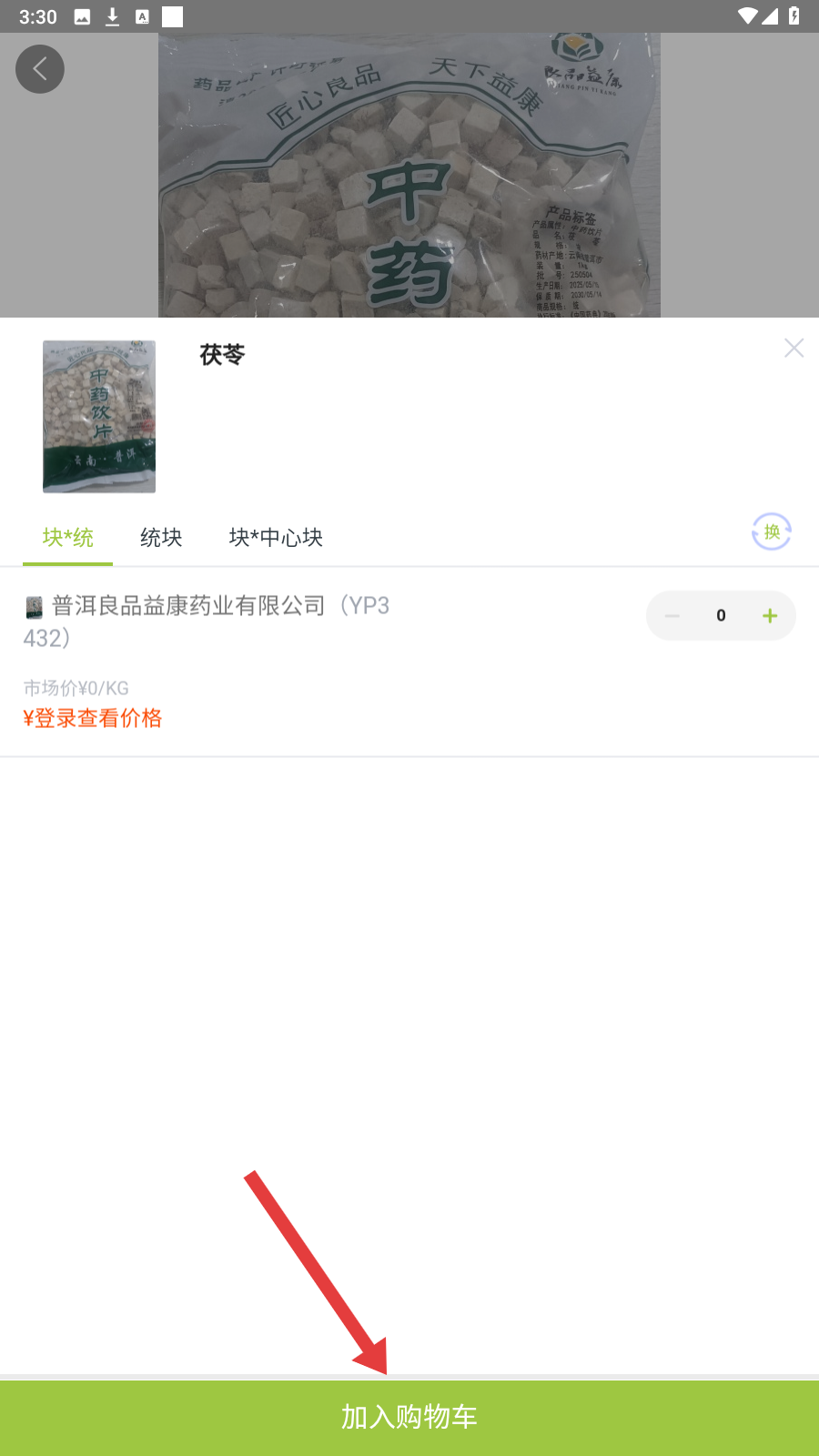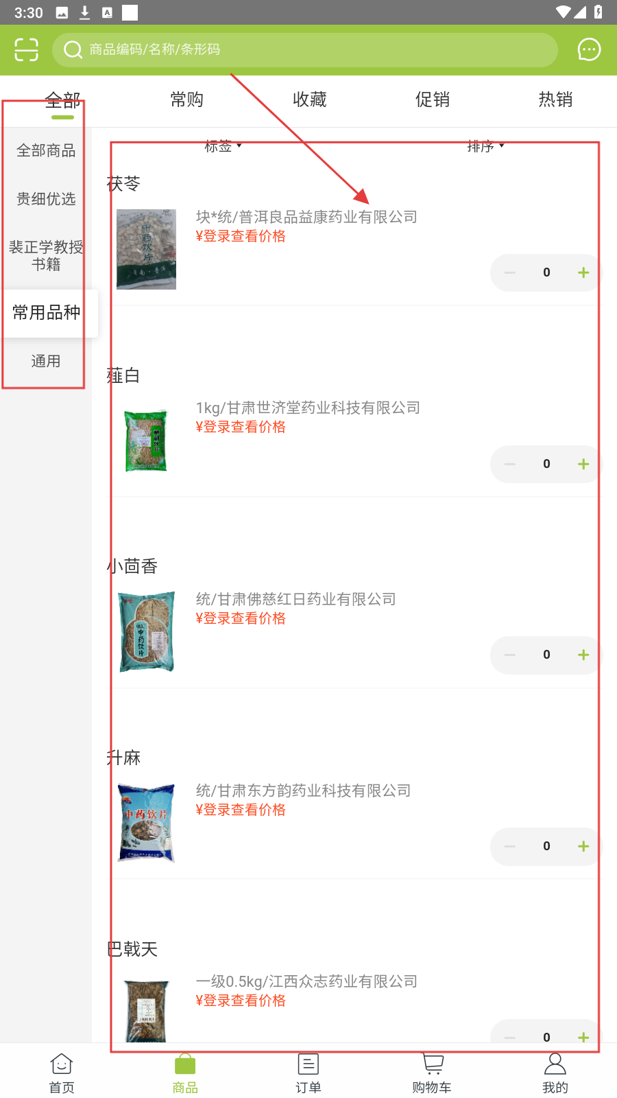 1、进入【商品】页,选分类找药材,如【常用品种】里的茯苓,点击进入。