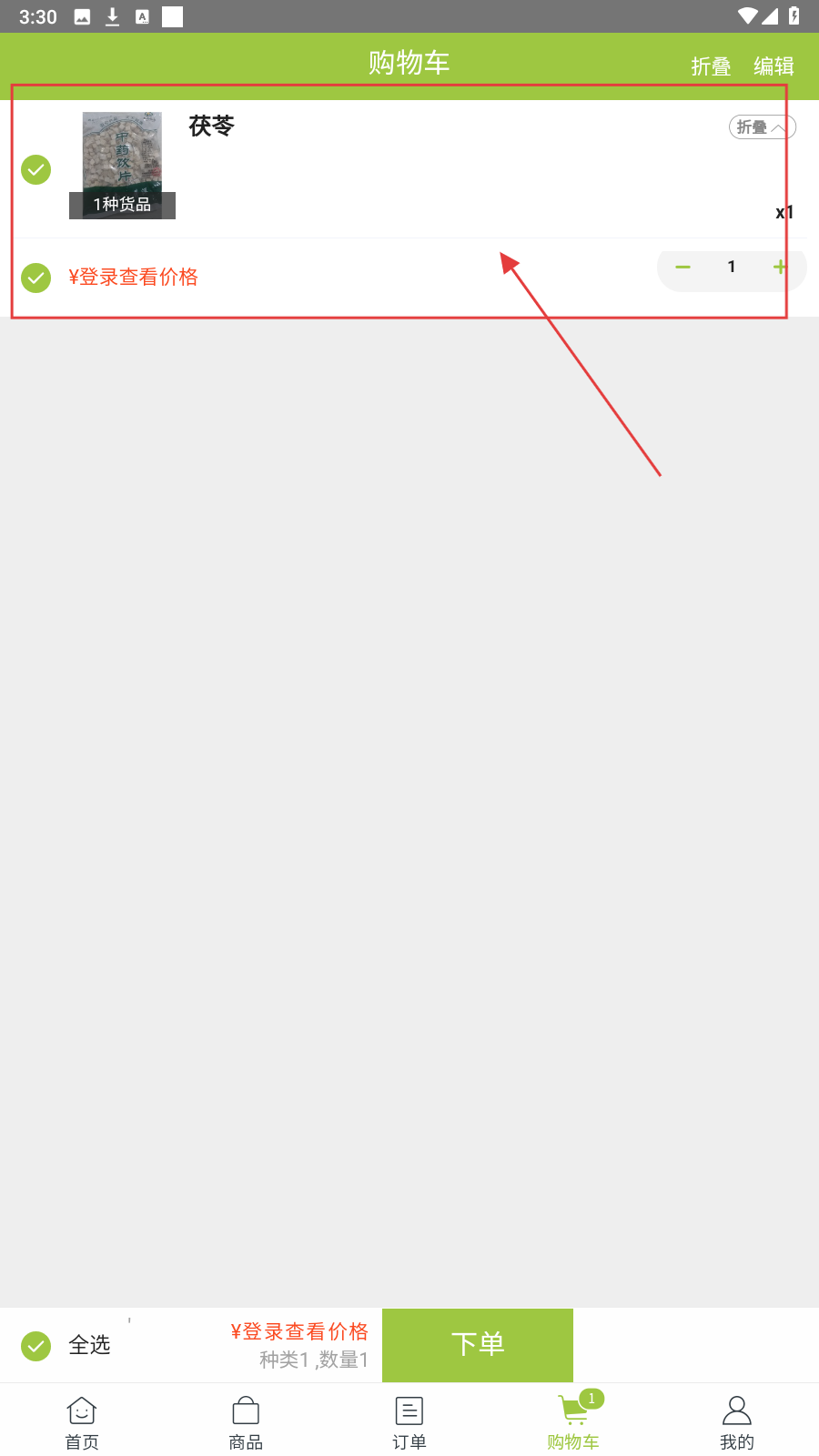 4、切换到【购物车】,勾选茯苓,点【下单】,完成采购流程。
