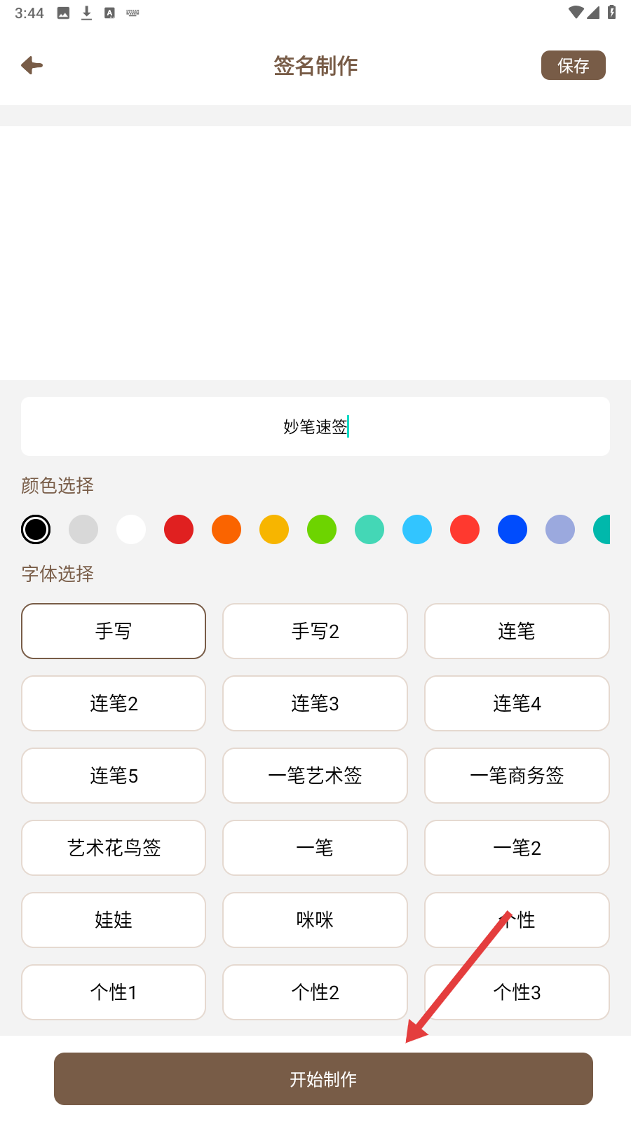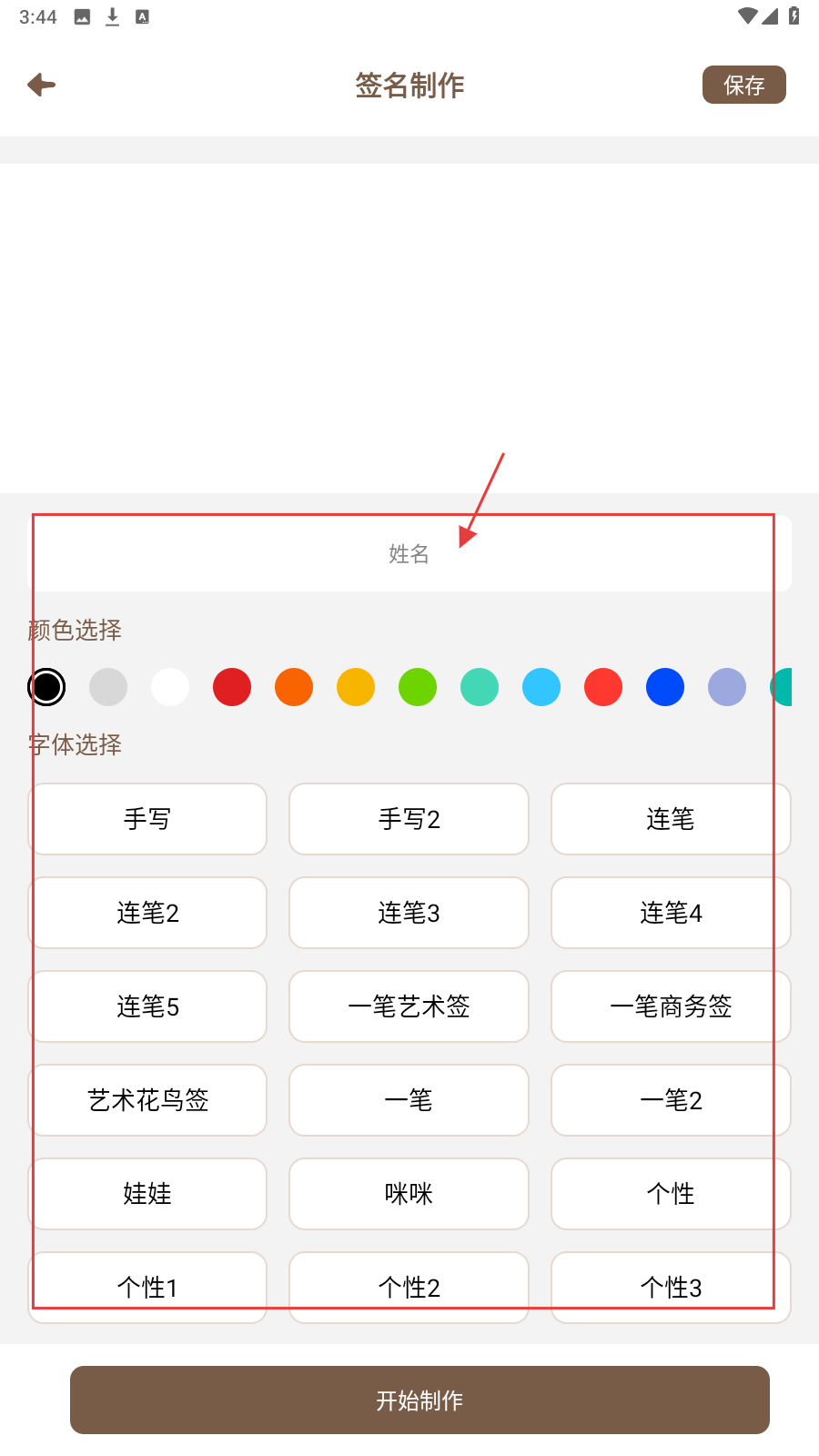 2、在签名制作页,输入姓名,选颜色与字体,如手写字体,准备定制。