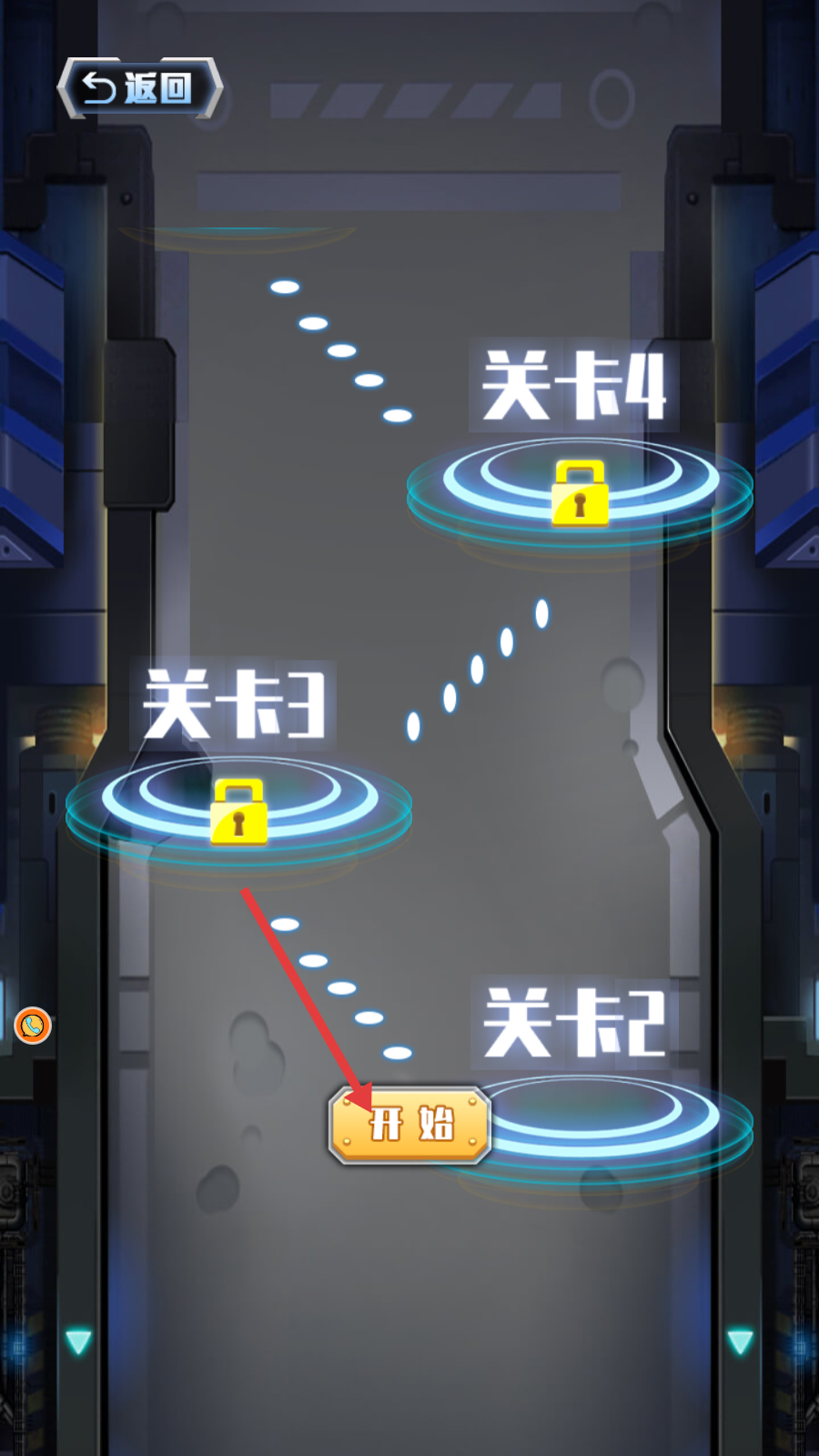 2、关卡选择界面中,点击【关卡2-开始】按钮进入战斗,完成当前关卡以解锁后续【关卡3】【关卡4】,逐步推进游戏进度。