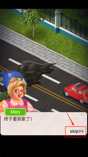 2、跳过剧情:当出现“Mary 终于要到家了!”对话框时,点击“skip>>”可快速略过剧情。