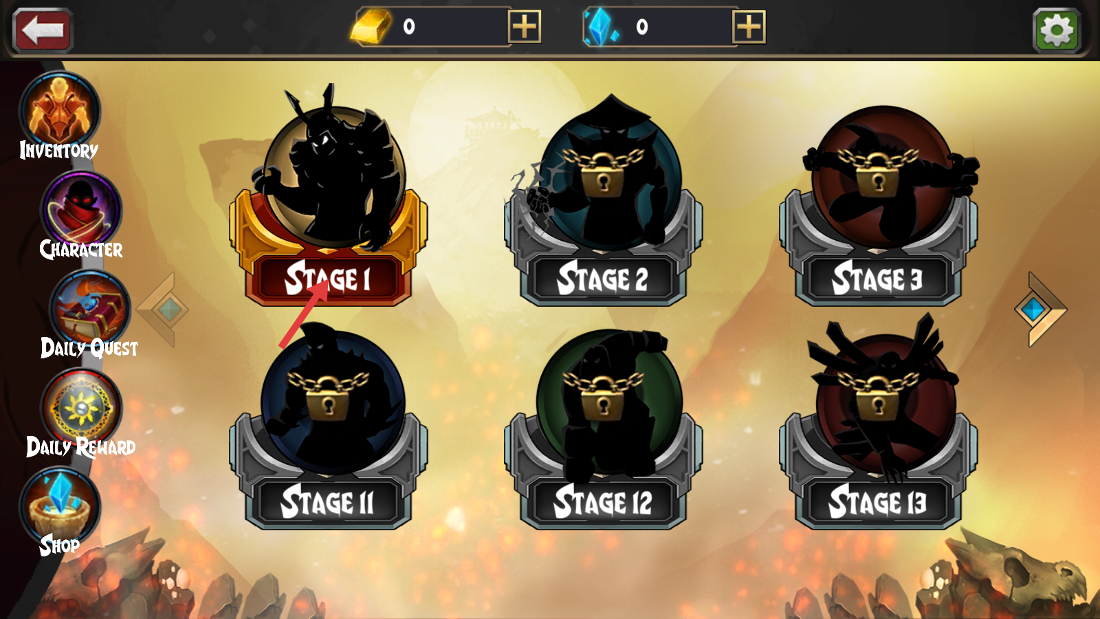 1、进入游戏选择【STAGE-1】,开启首场战斗,左侧功能栏可后续探索,专注当前关卡挑战。