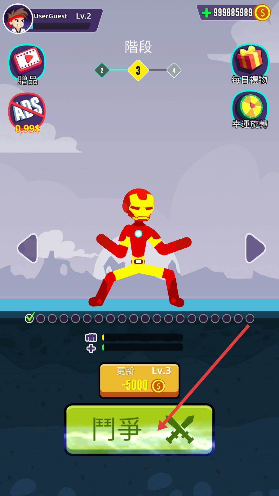 1、点击【鬥爭】进入第3阶段战斗,当前角色Lv.2,可消耗5000金币更新至Lv.3,提升战力再挑战。