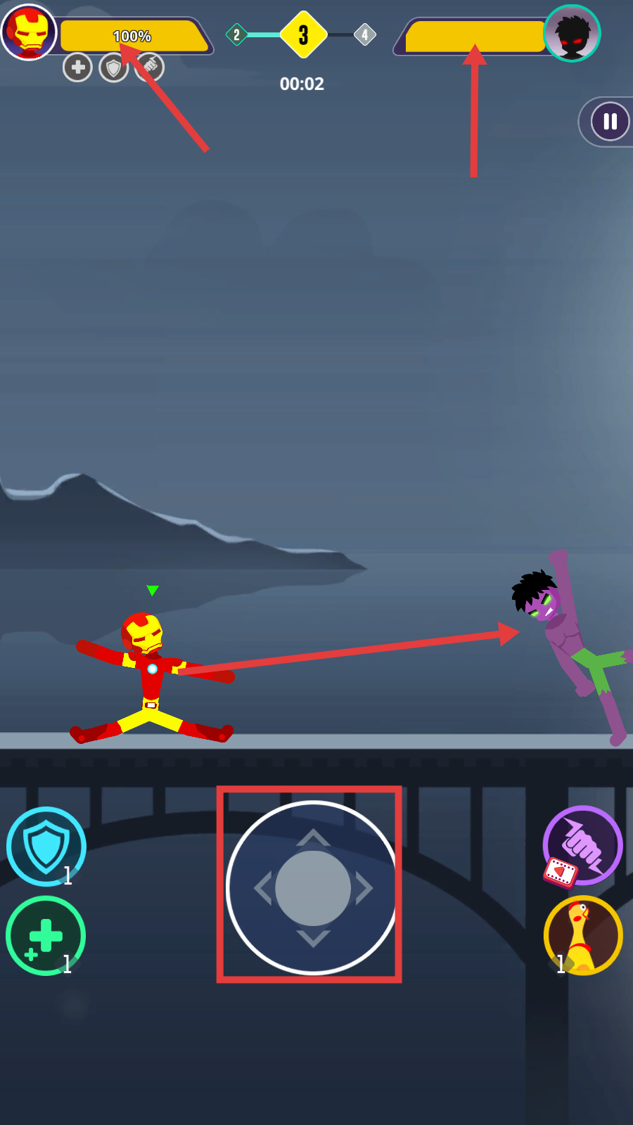 2、战斗开始,操控摇杆移动角色,利用技能攻击紫色对手,初始血量【100%】,保持攻势消耗敌方血量。