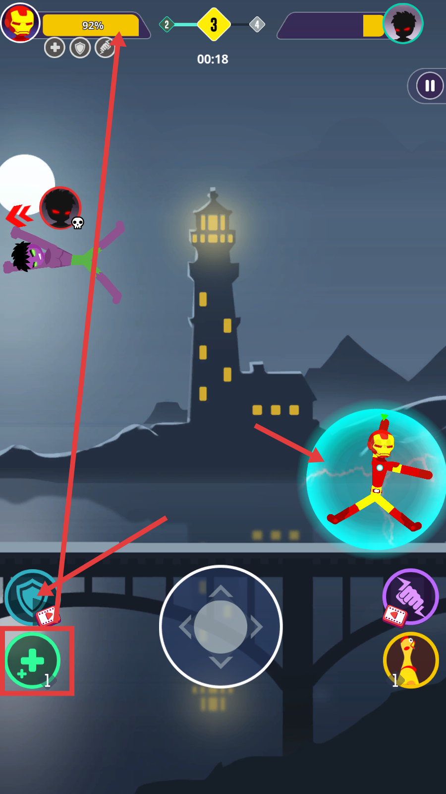 3、血量降至【92%】时,点击左侧治疗与护盾按钮,回复生命并减伤,借助技能特效持续压制敌人。