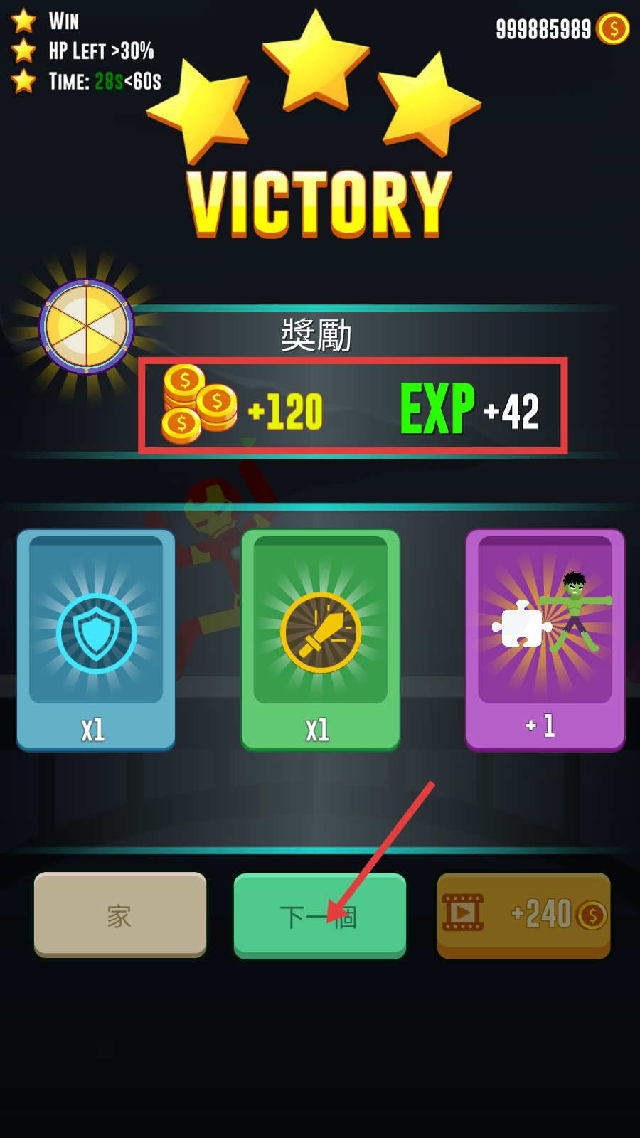 4、胜利后获得【金币-+120】与【EXP-+42】,点击【下一個】继续挑战,积累资源用于角色升级强化。