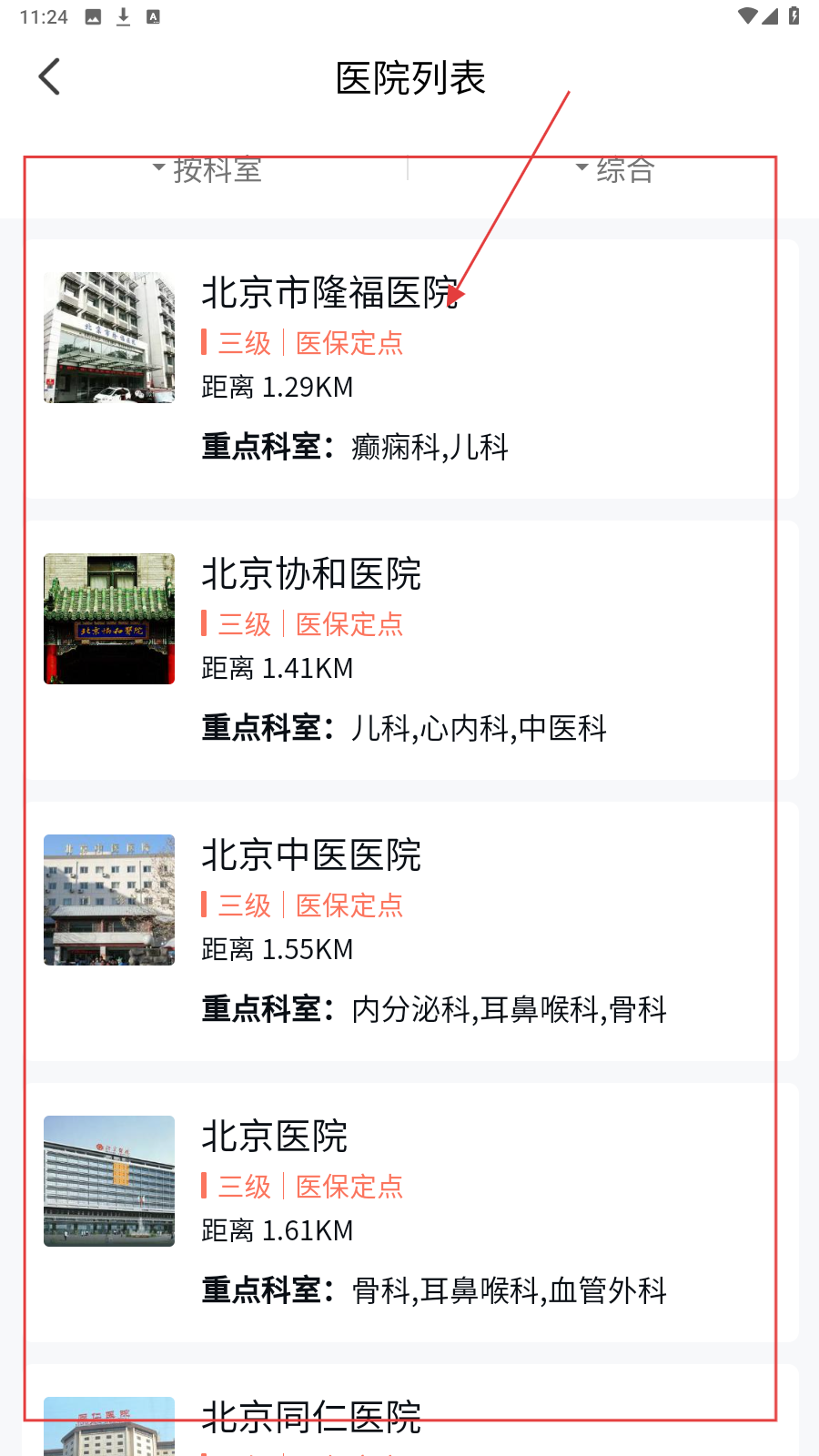 2、在【医院列表】页面,选择目标医院并点击。