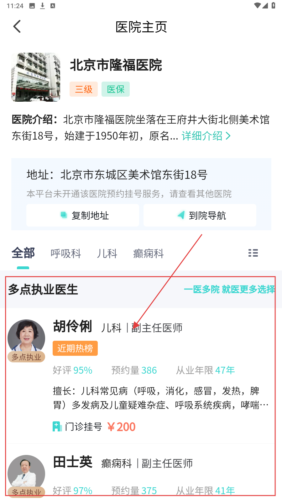 3、进入【医院主页】,选择擅长治疗对应病症的医生点击。