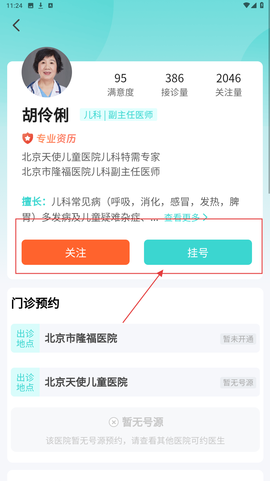 4、在医生个人资料页面,点击【挂号】即可进行预约。