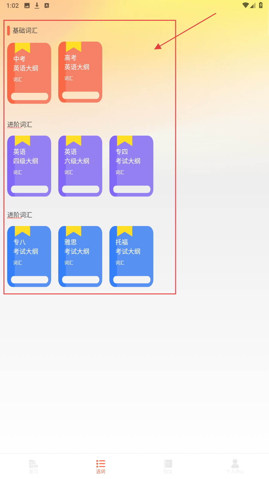 1、在选词页,选对应考试大纲词汇(如中考英语大纲),进入词汇列表。