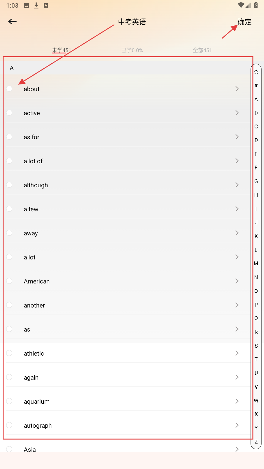 2、在词汇列表,勾选要学单词(如about),点【确定】加入学习。